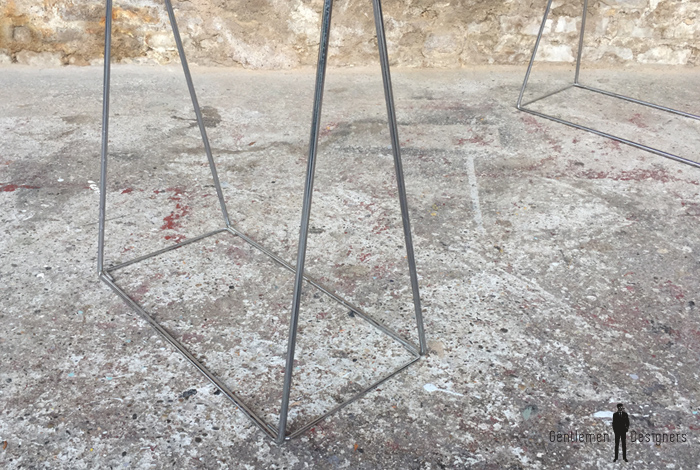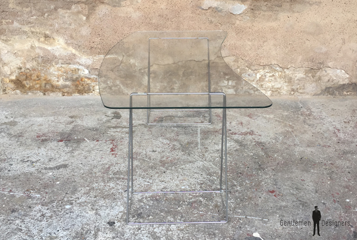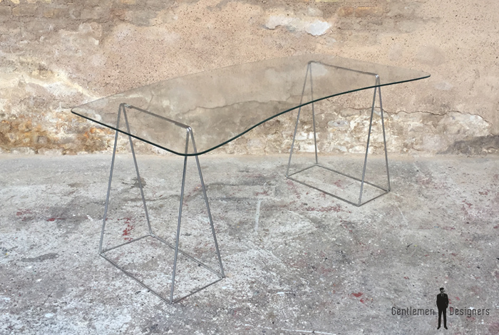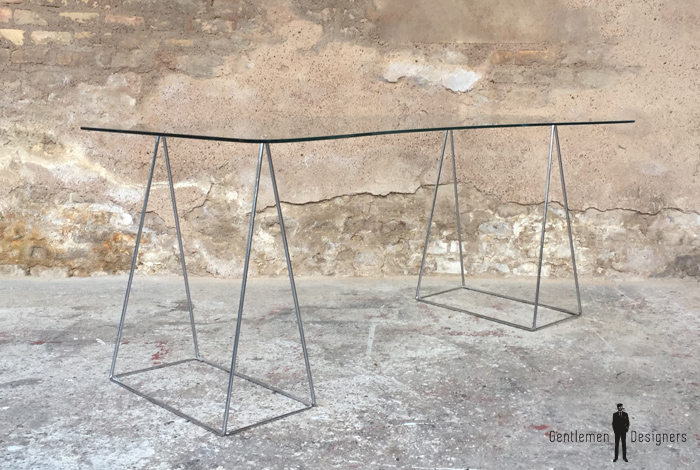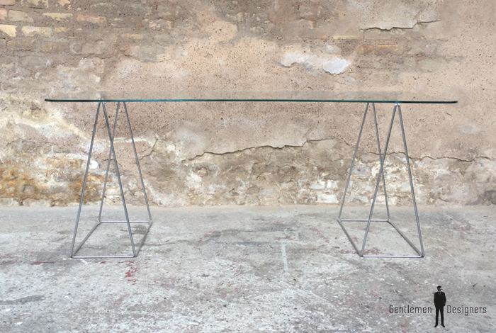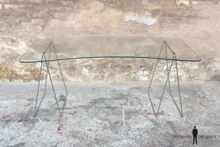 Quelques impacts et rayures visibles sur le plateau en verre. Tréteaux en très bon état.