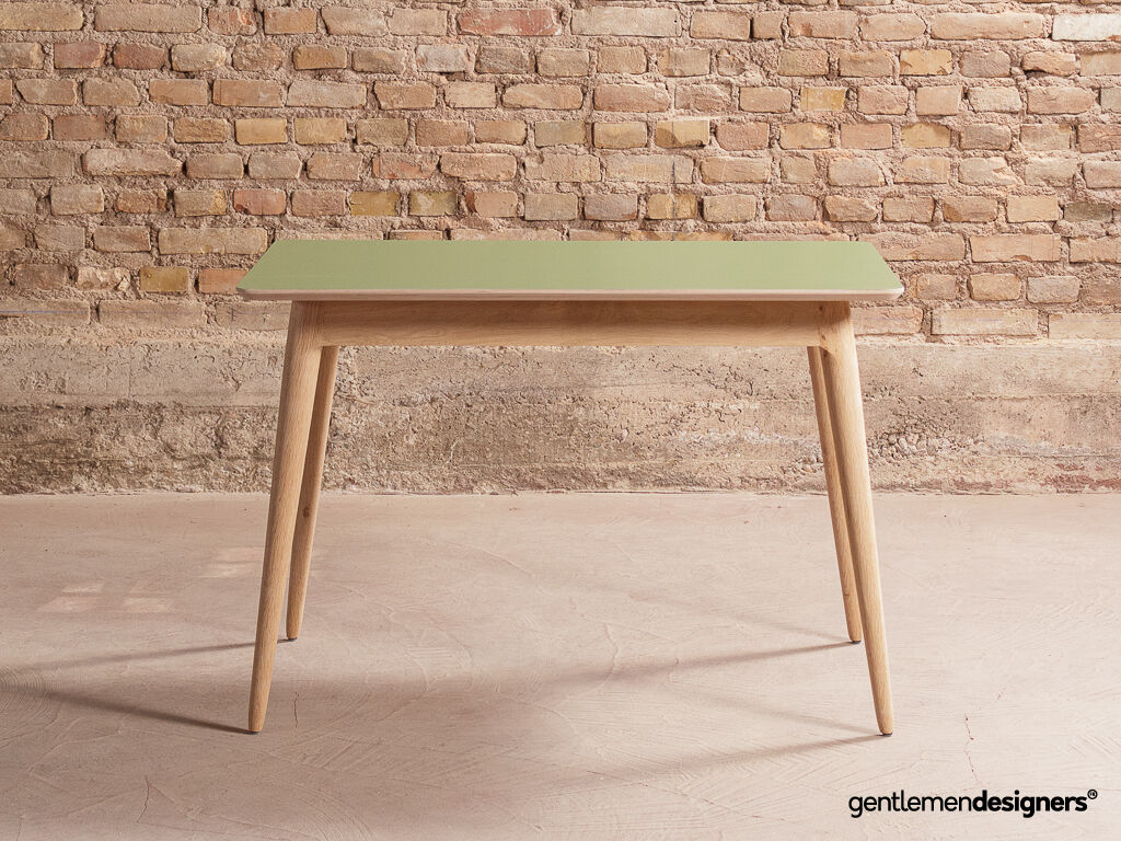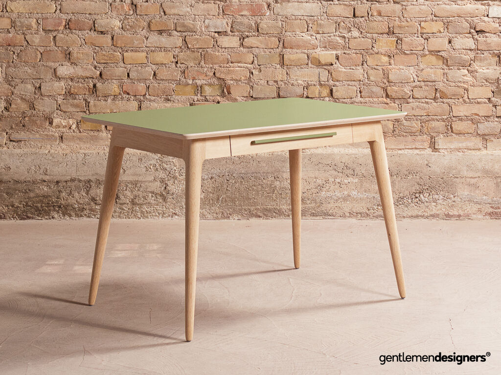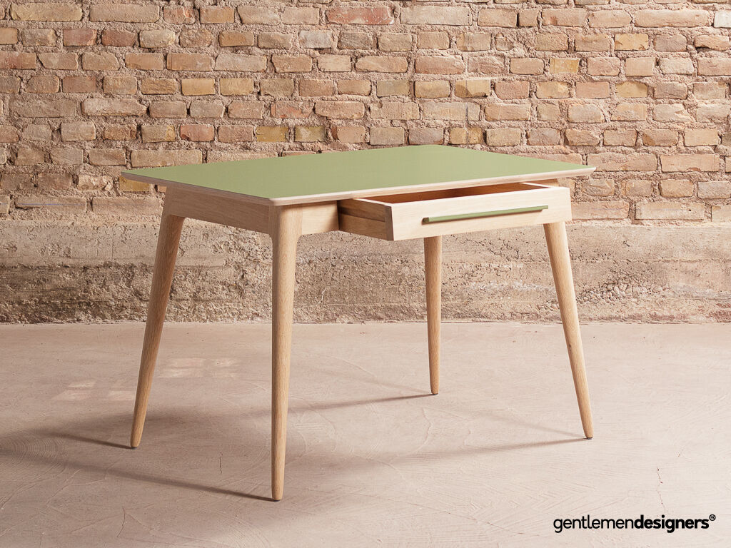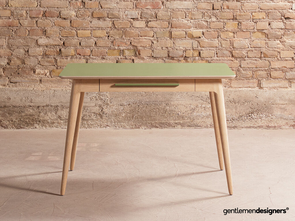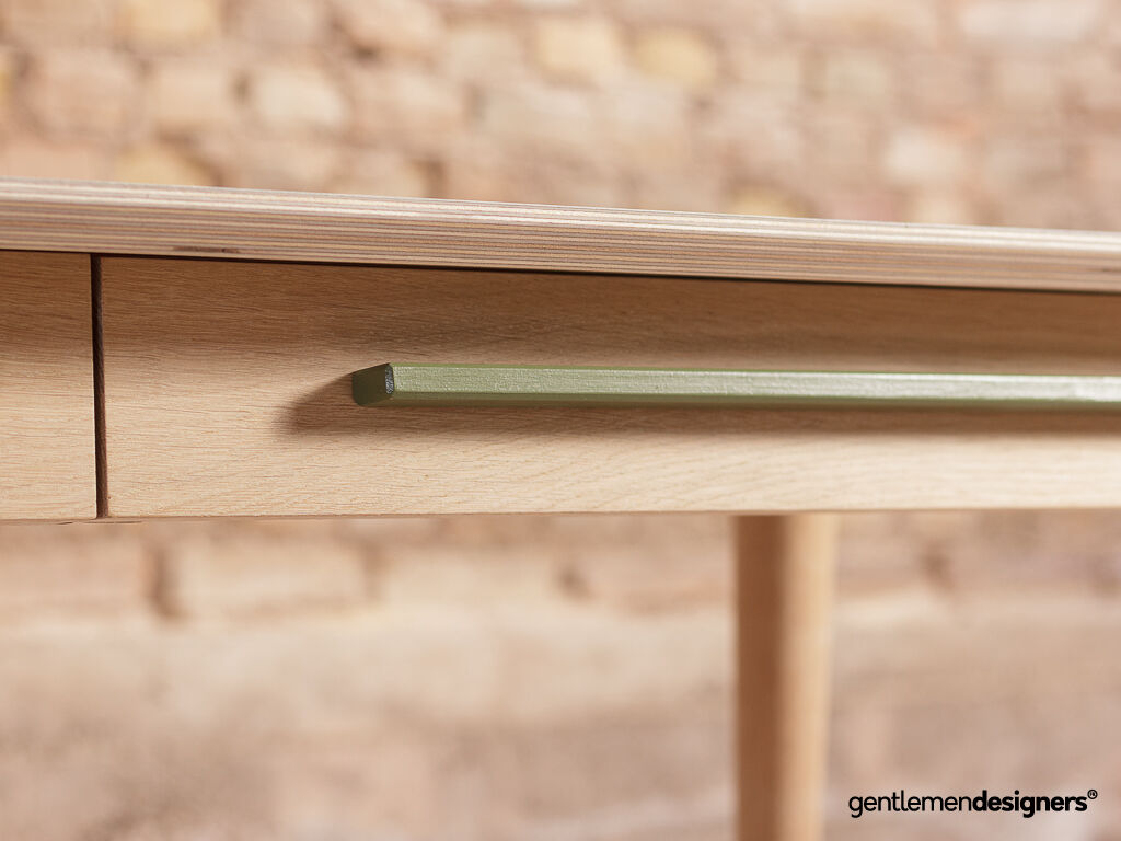 Bureau sur-mesure stratifié vert avec piétement en chêne massif local disposant d'un tiroir de rangement