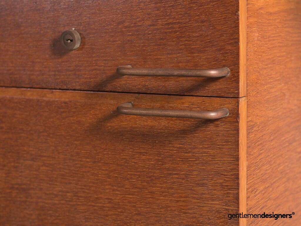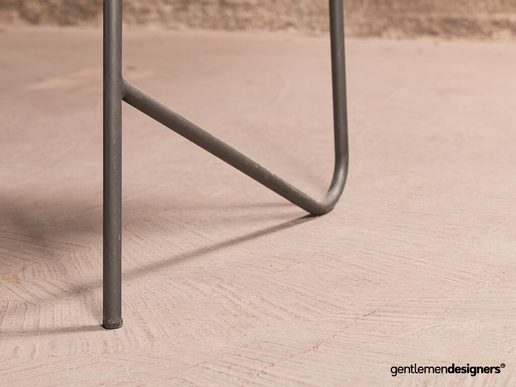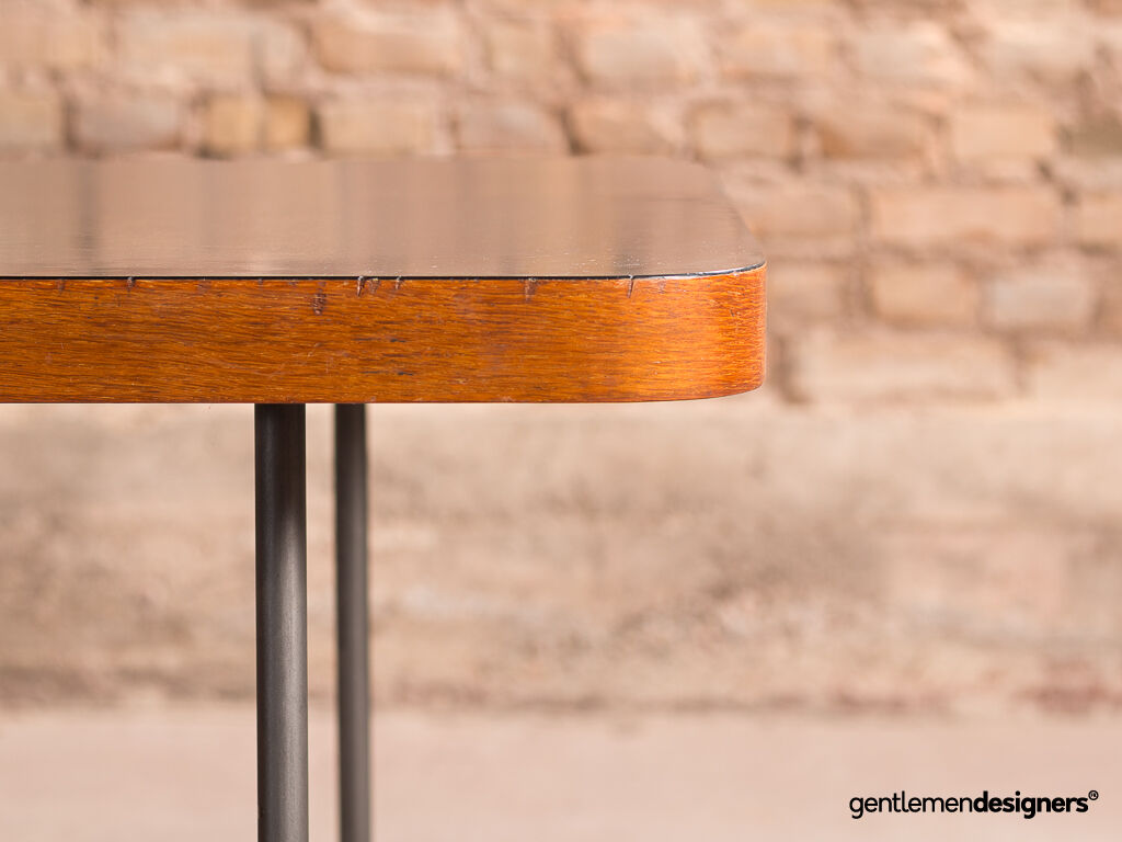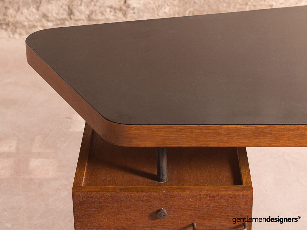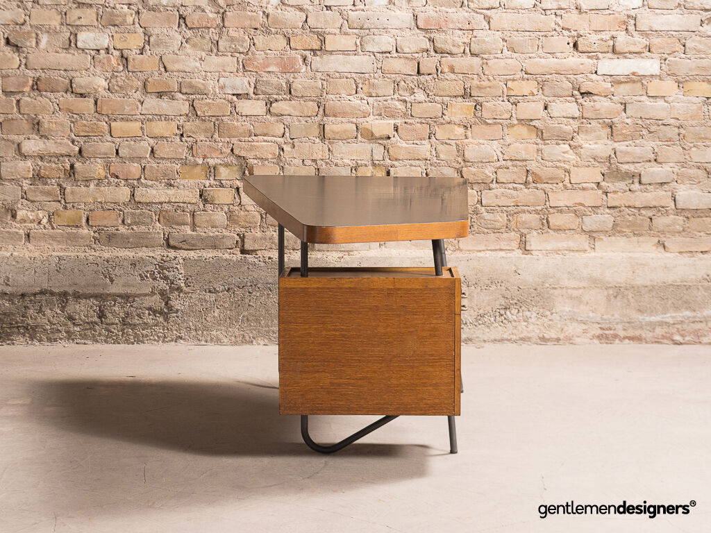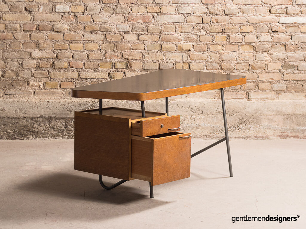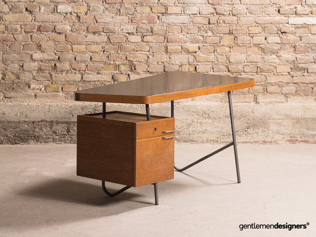 Magnifique bureau asymétrique vintage dessiné par Georges Frydman dans les années 50. Son design minimaliste est une belle réussite. Ses lignes raffinées et épurées en font une pièce d’exception. Piètement tubulaire en métal.