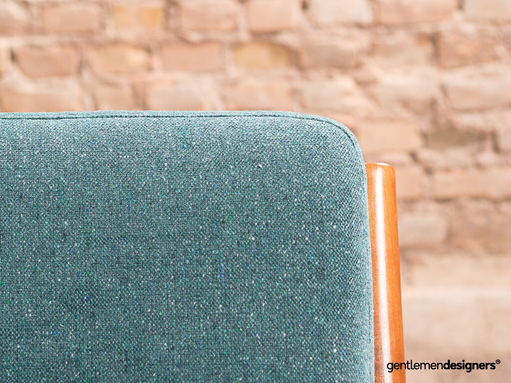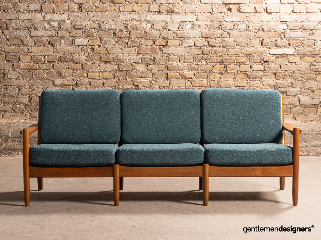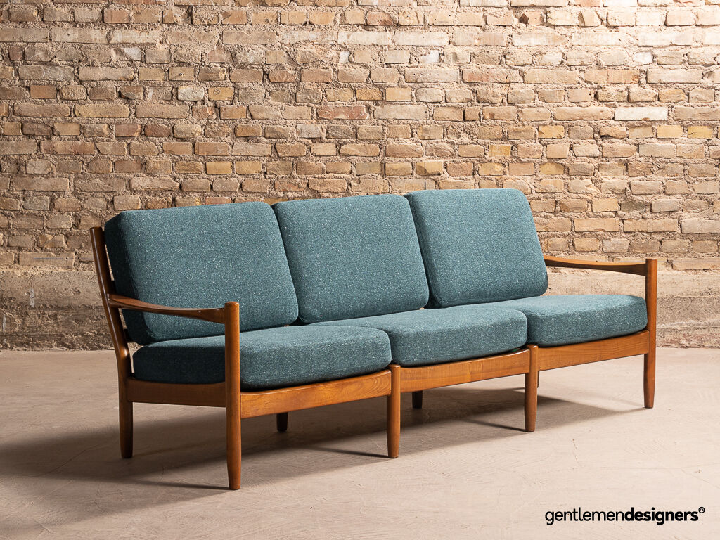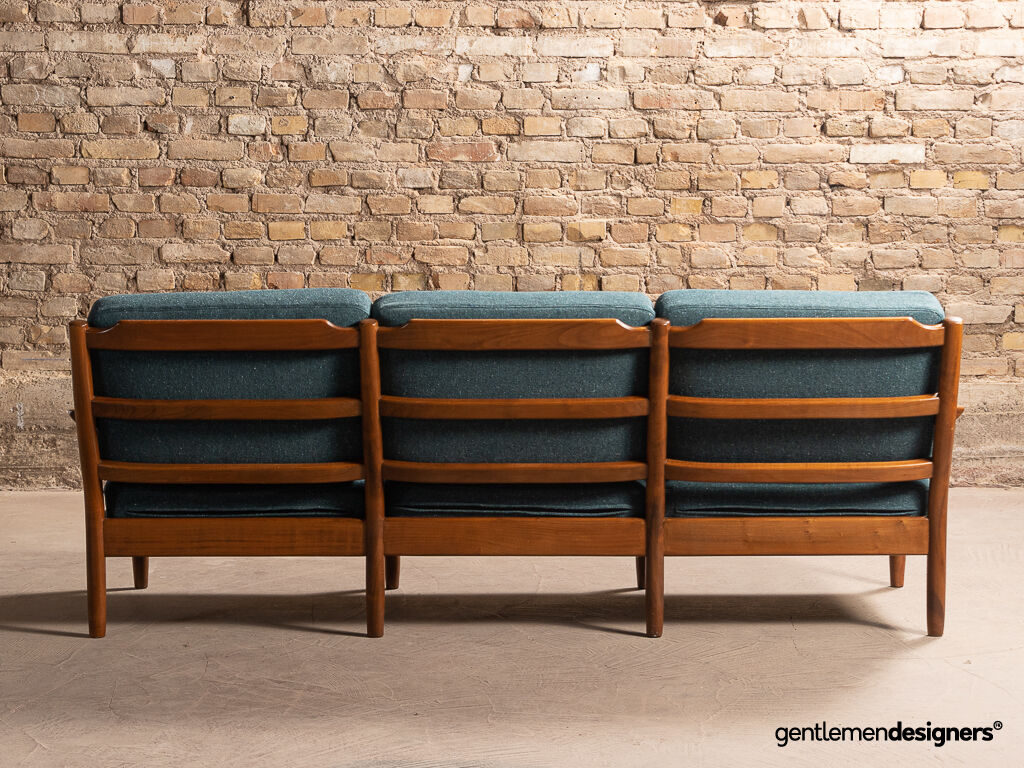Accueil » Produits » Meubles vintage » Assise » Canapé » Canapé scandinave en frêne massif teinté, restauré avec un tissu bleuté
