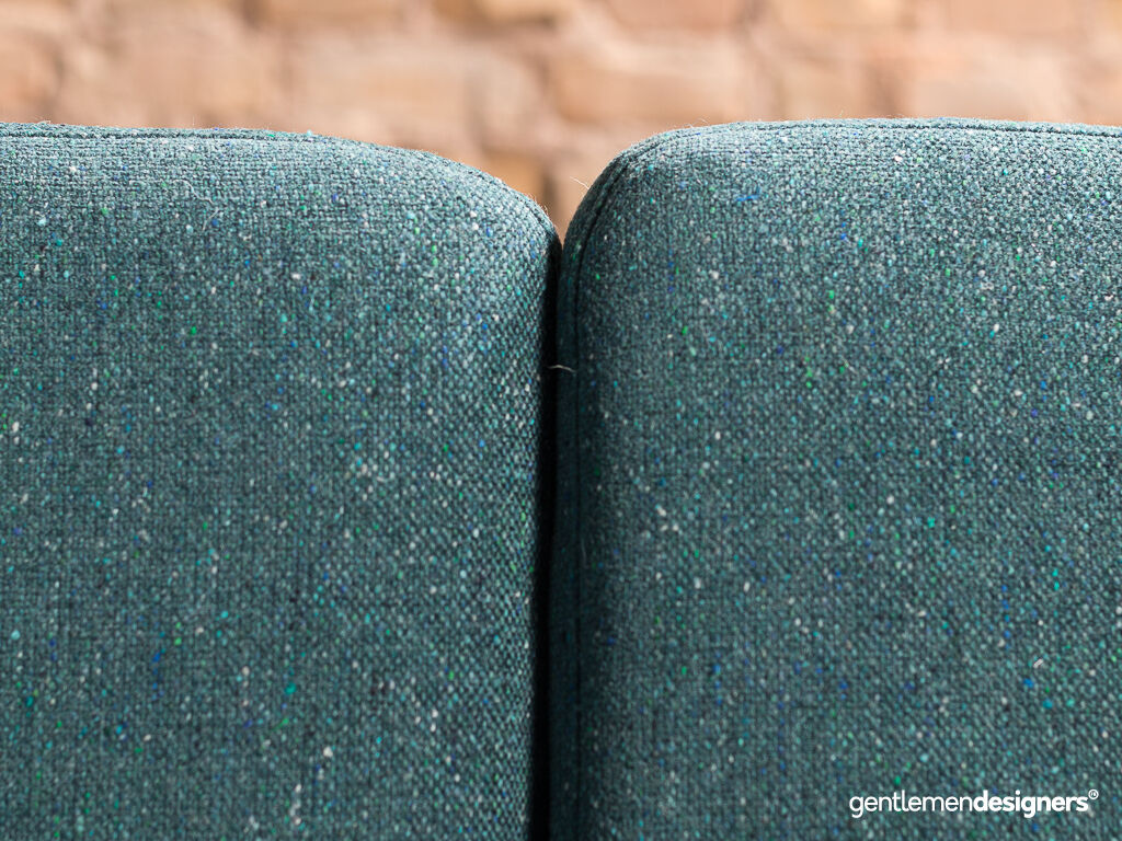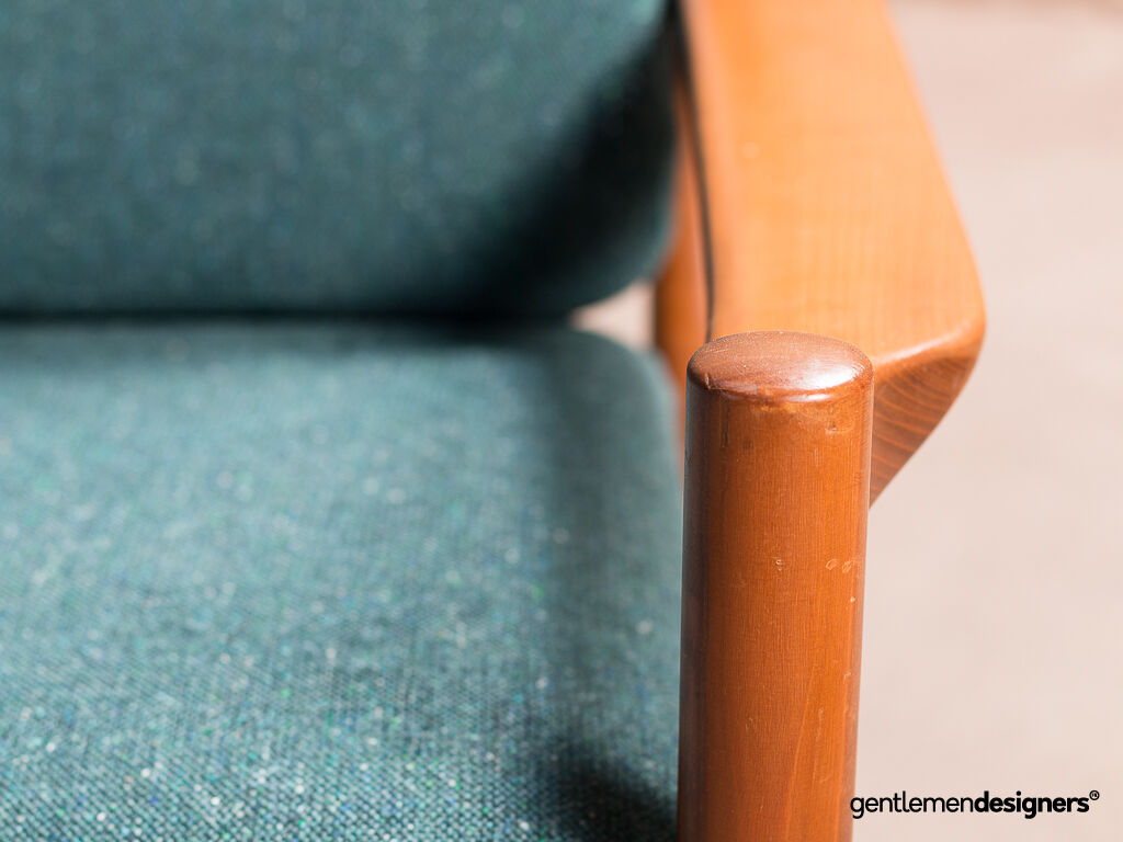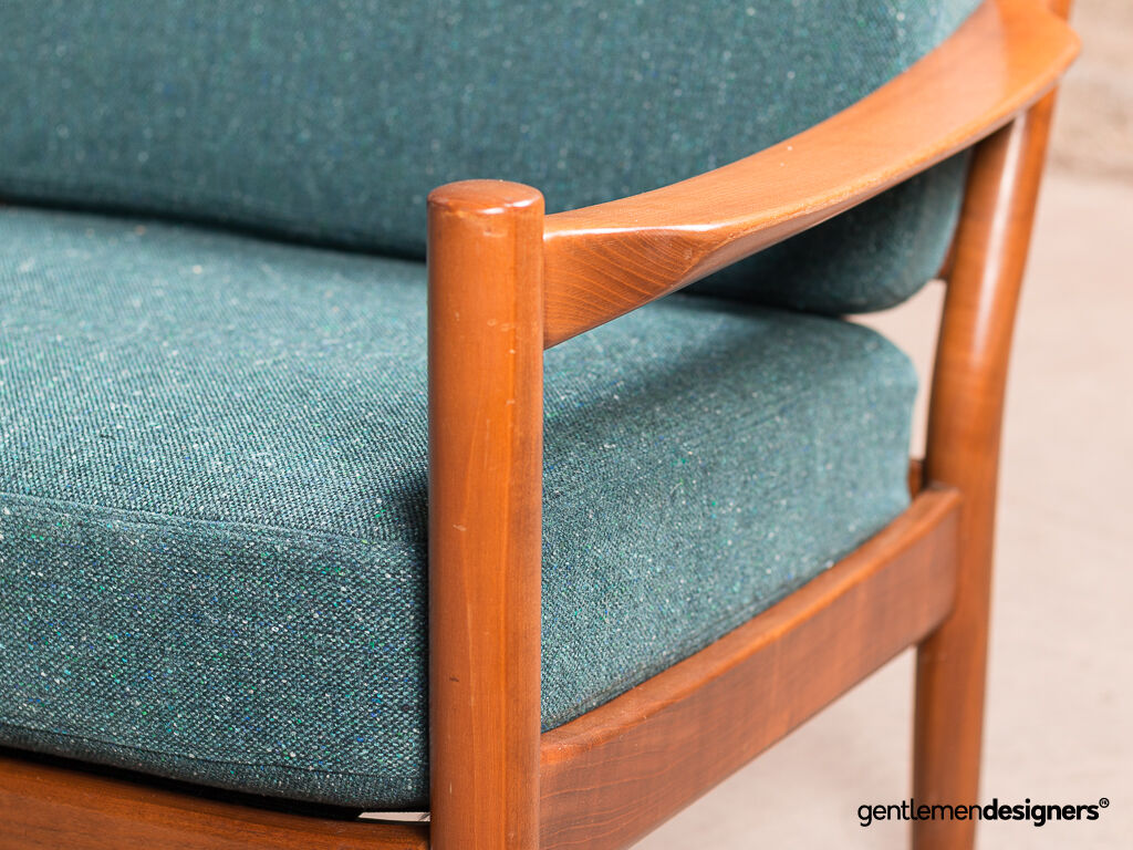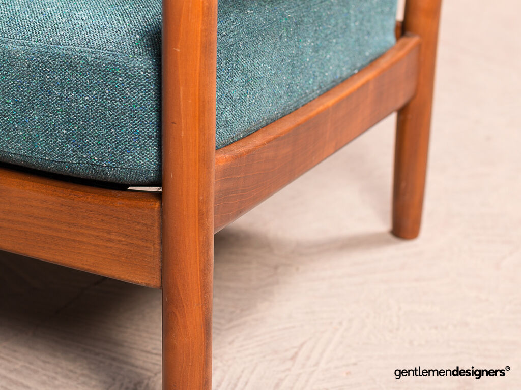 Accueil » Produits » Meubles vintage » Assise » Canapé » Canapé scandinave en frêne massif teinté, restauré avec un tissu bleuté