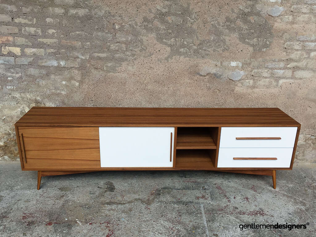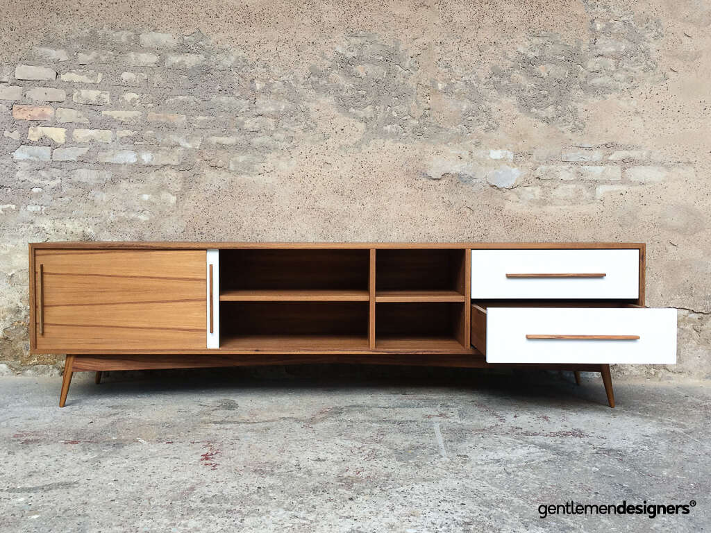 Meuble TV en teck avec des portes coulissantes, tiroirs et niches