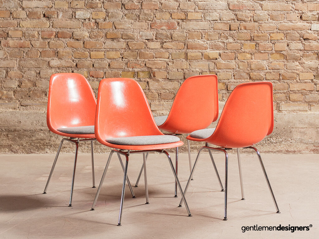 Ensemble de quatre « DSX » (Dining Height Side Chair X-Base) des chaises conçues par Charles et Ray Eames. Fabriqué par Herman Miller Vitra, vers 1970. Coques en fibre de verre orange sur piètement en tube d’acier chromé. Très bon millésime état de santé excellent.