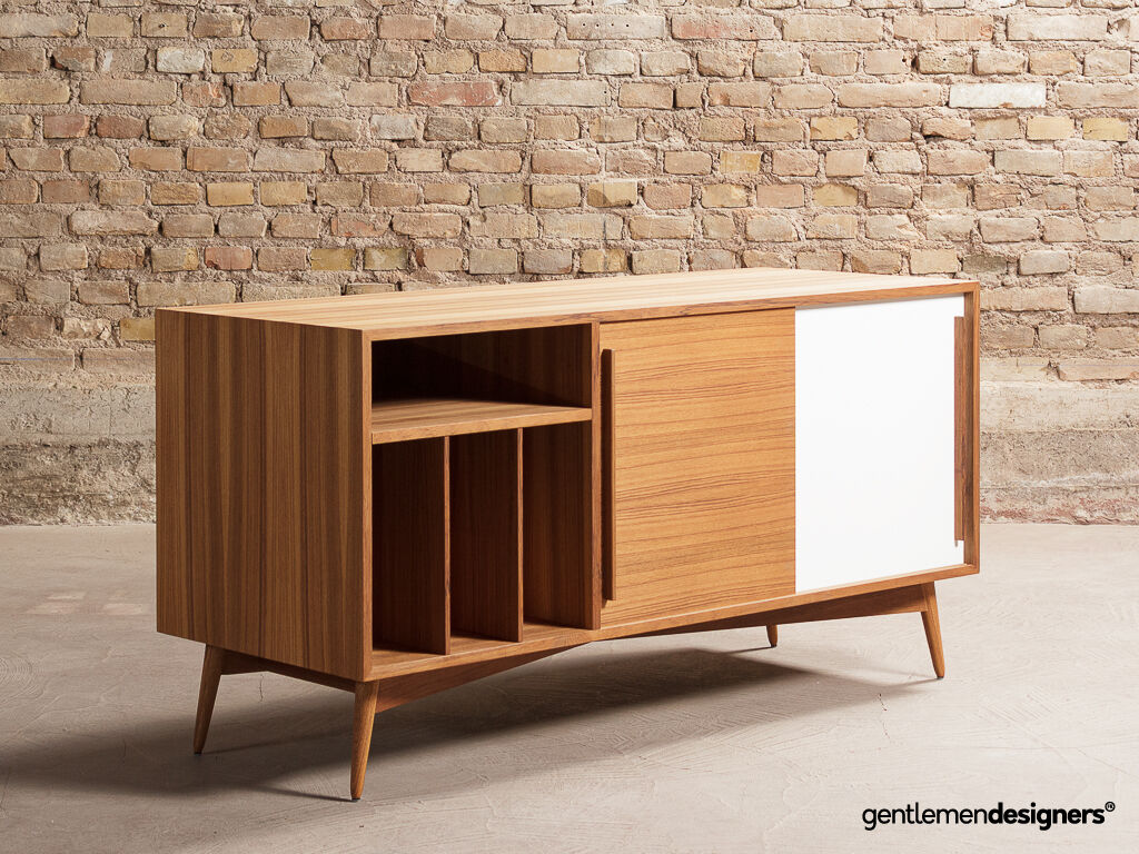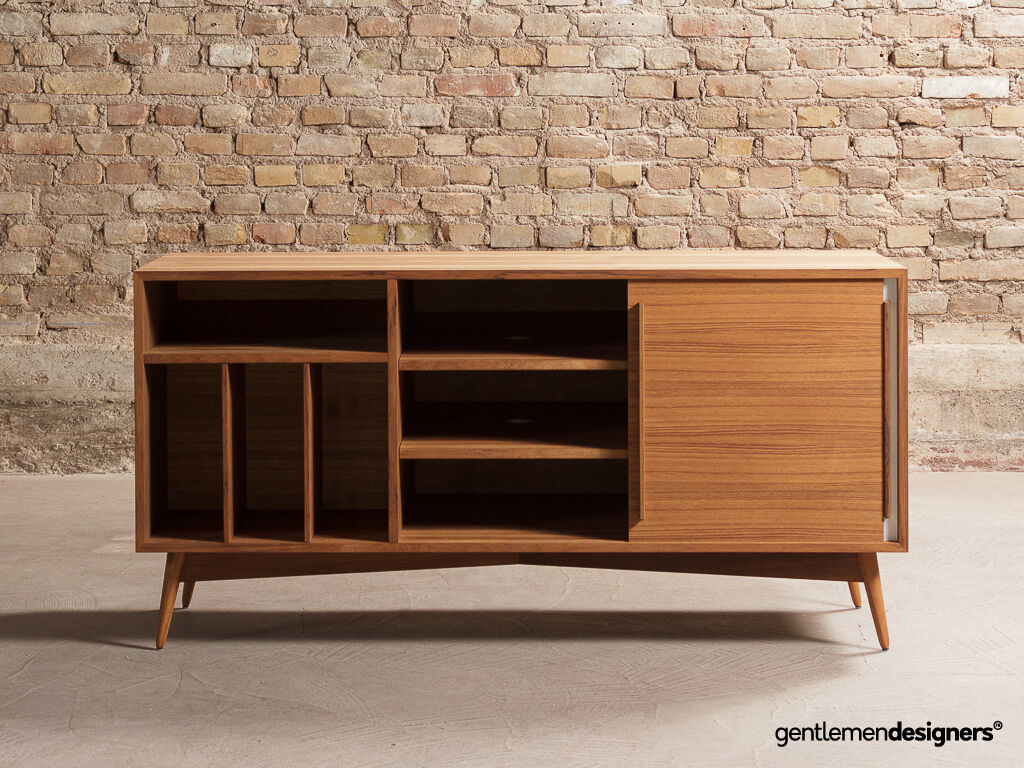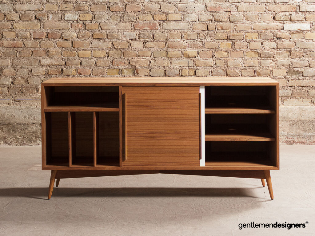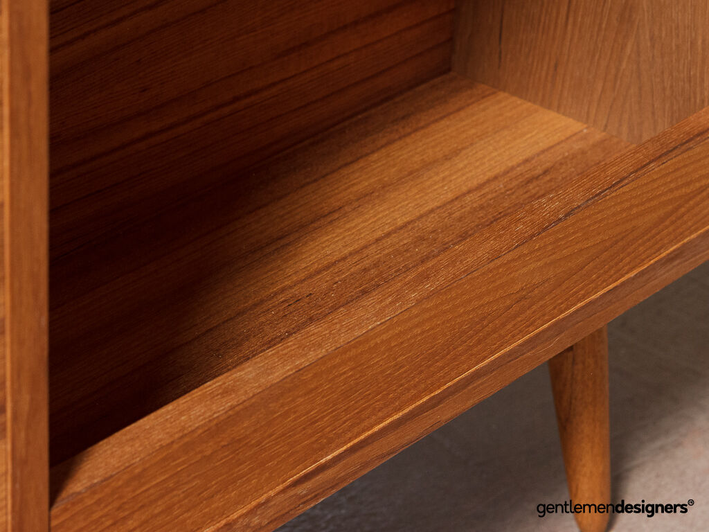 Meuble Hifi en teck avec emplacements pour disques vinyles, piétement et poignées en teck massif