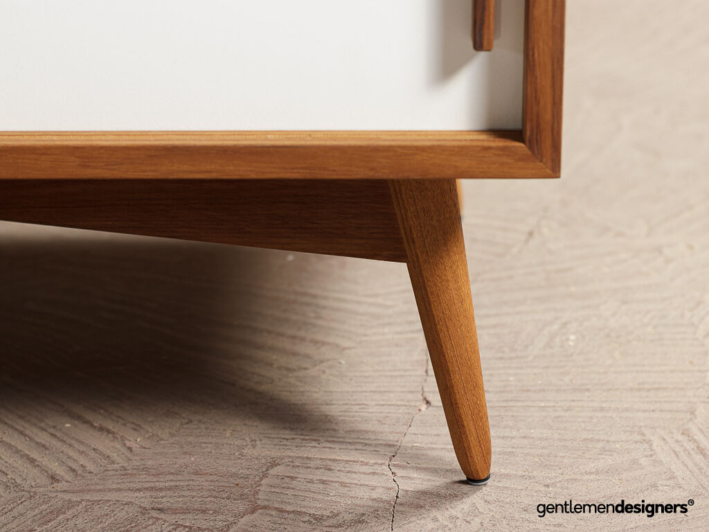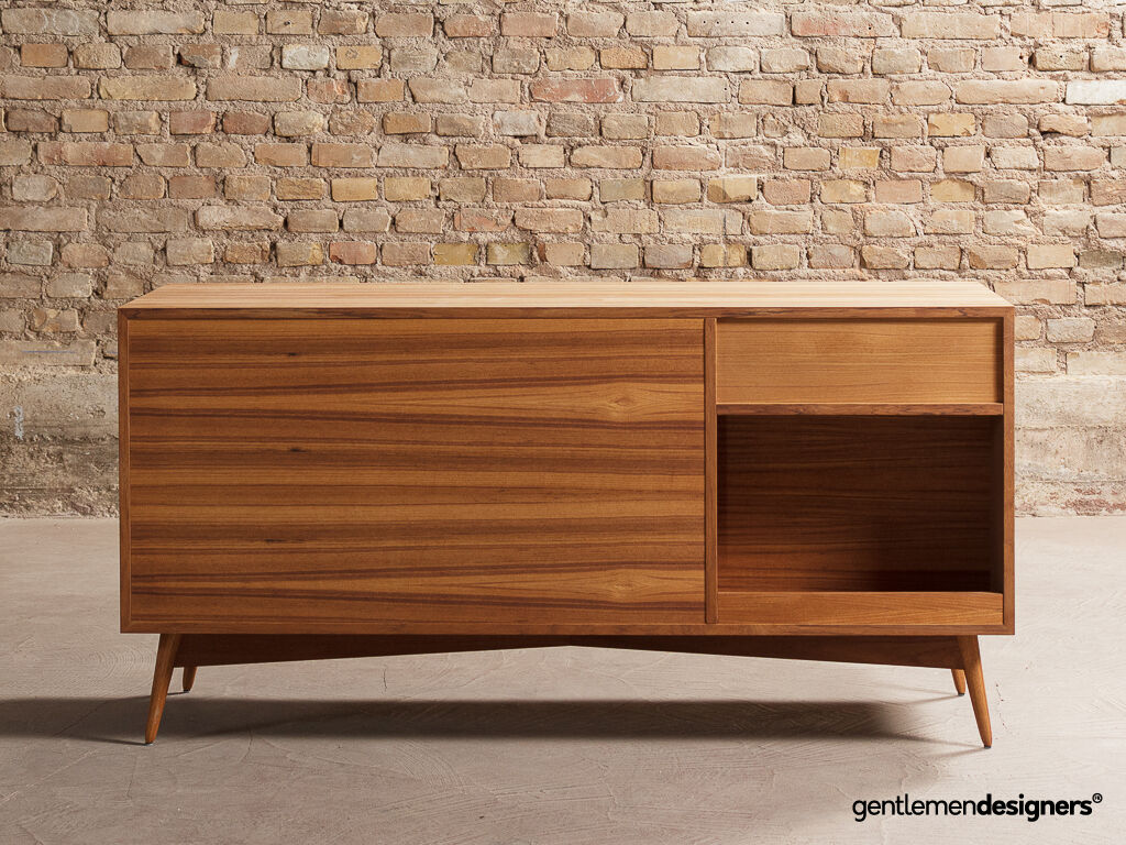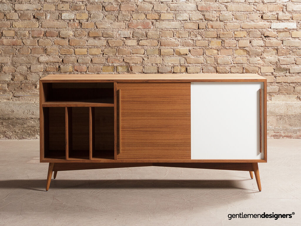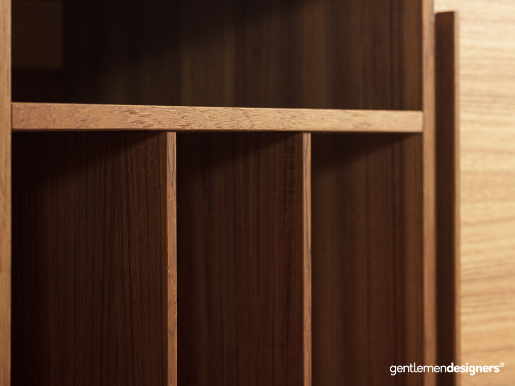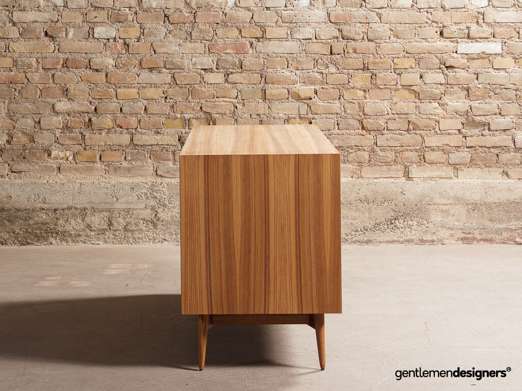Meuble Hifi en teck avec emplacements pour disques vinyles, piétement et poignées en teck massif