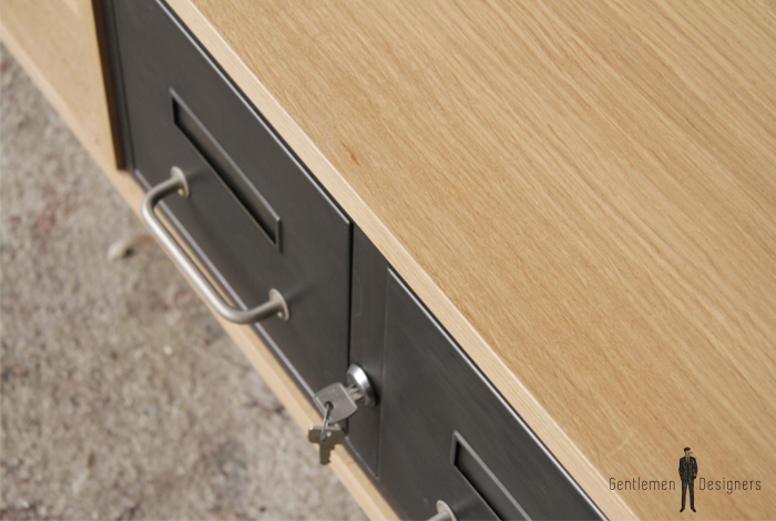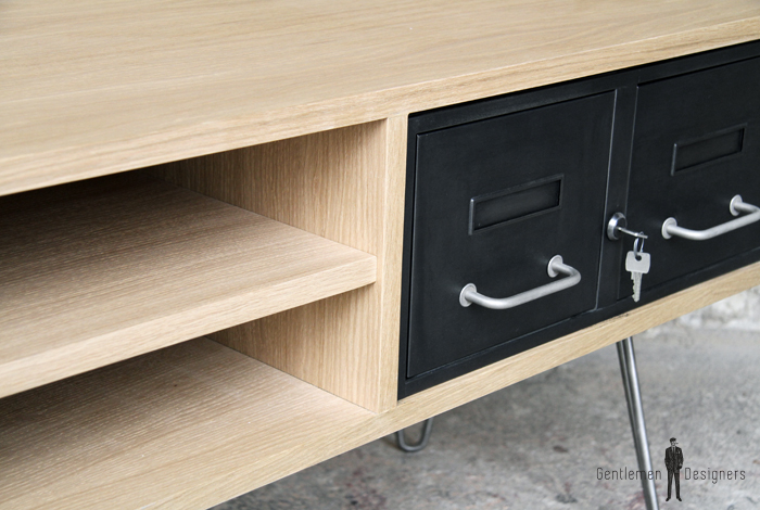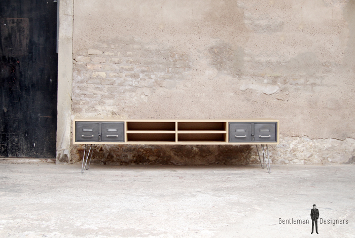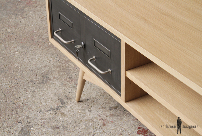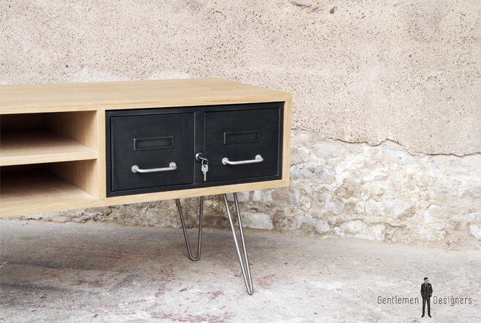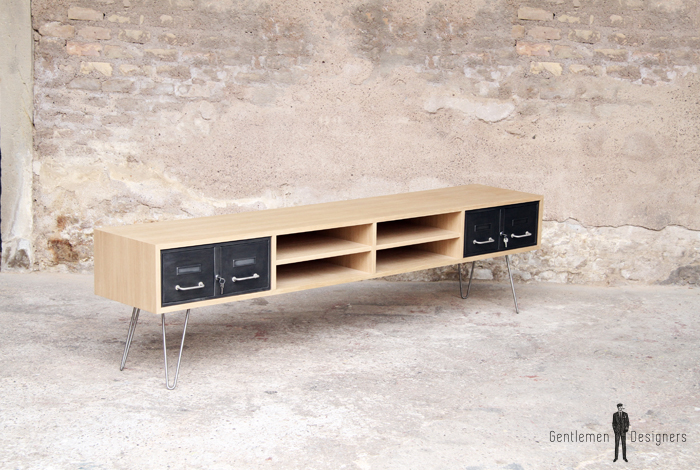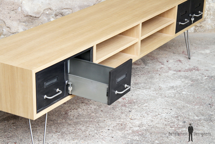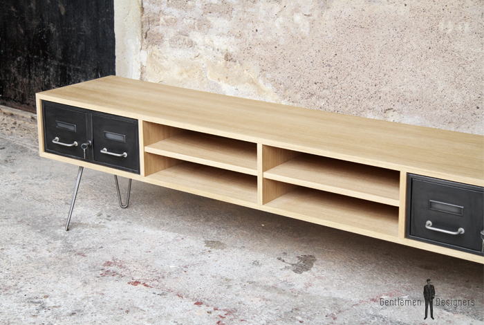 Meuble TV en chêne avec des tiroirs industriels et des pieds métal