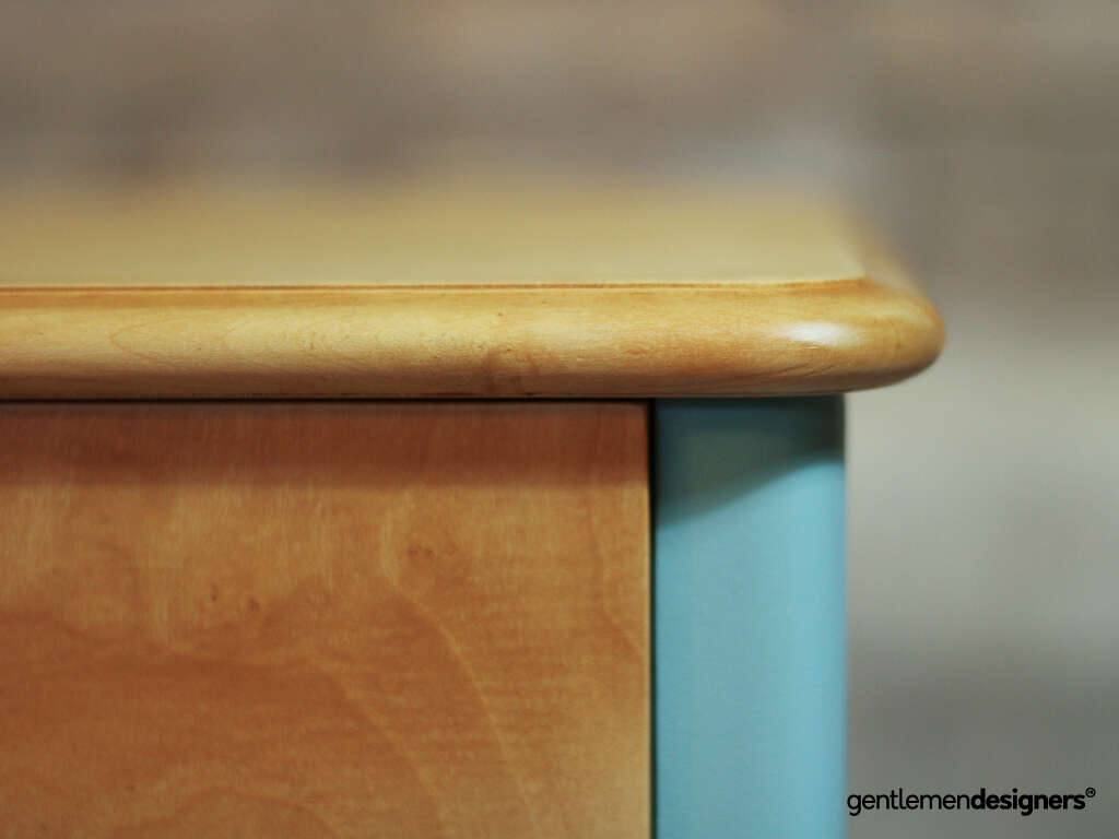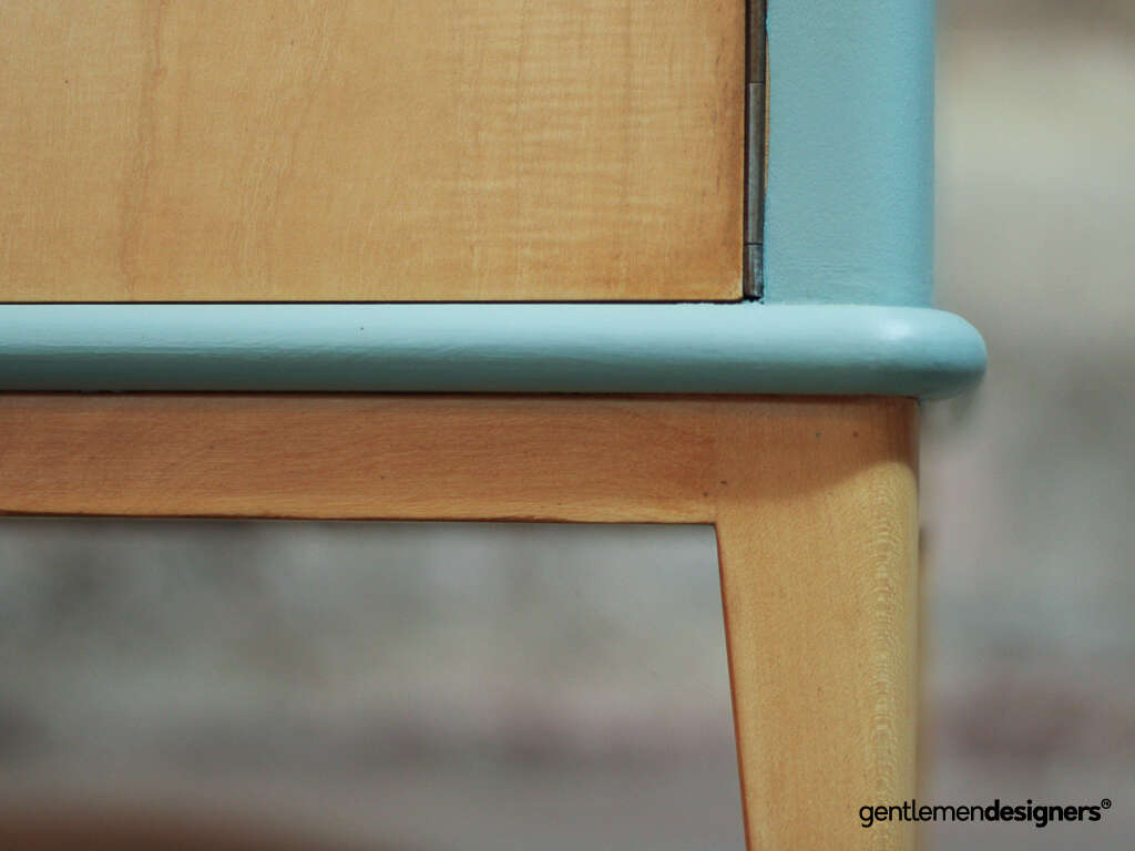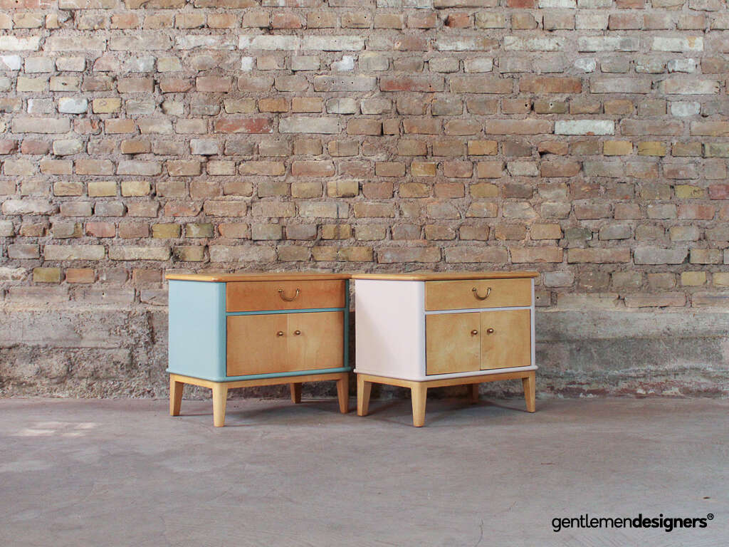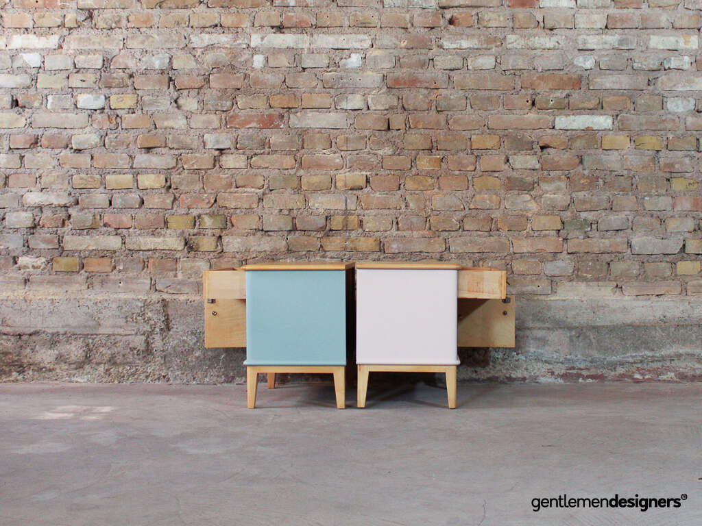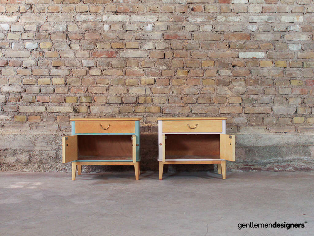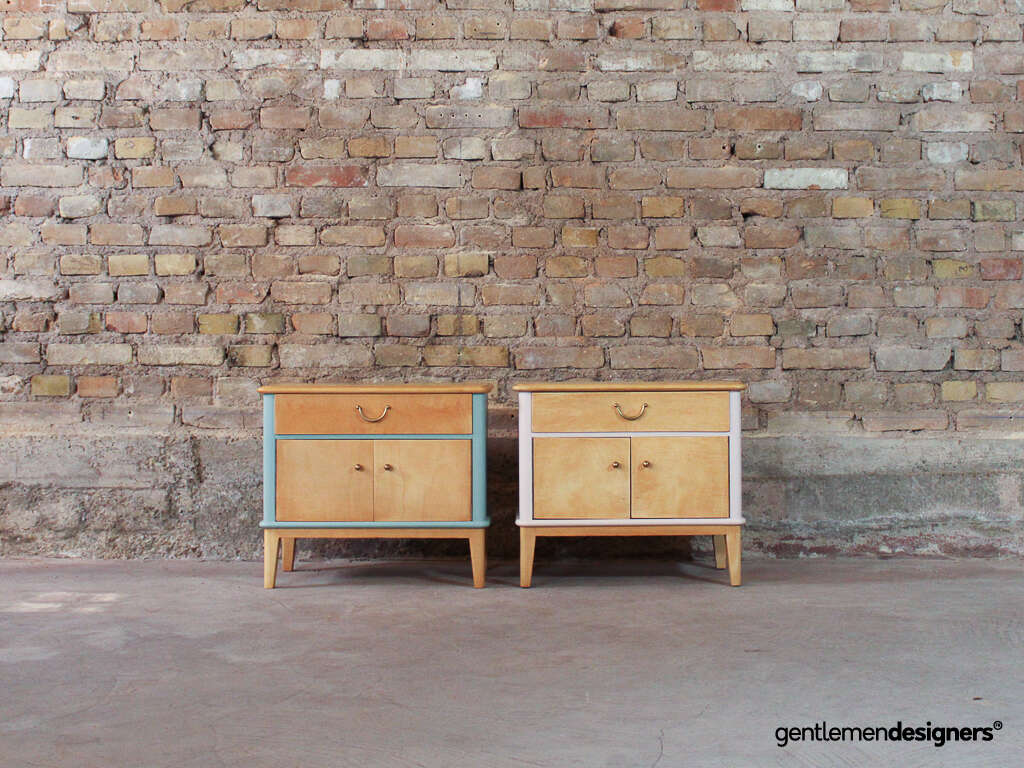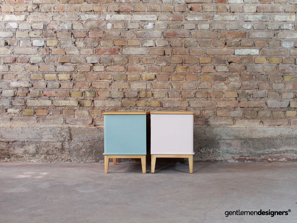 Accueil » Produits » Meubles vintage » Table » Table de nuit, chevet » Paire de chevets vintage en bois massif relookés rose clair et bleu ciel, circa 1960