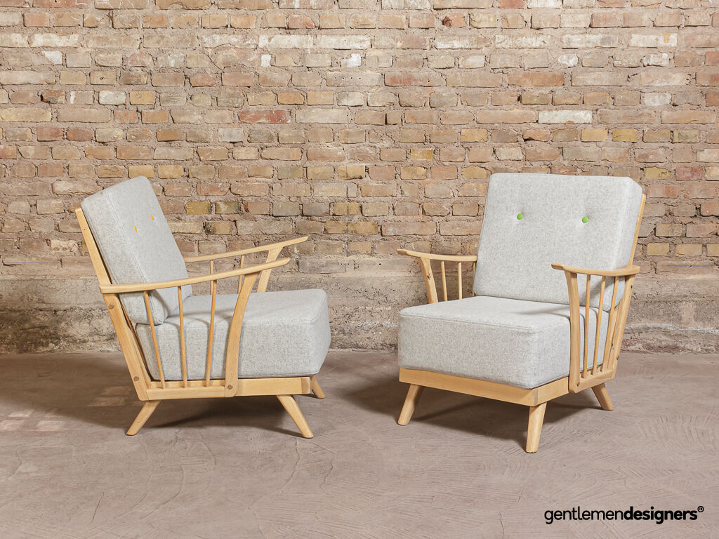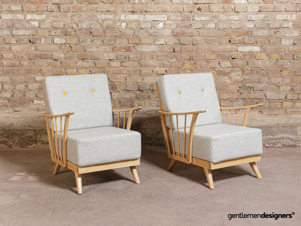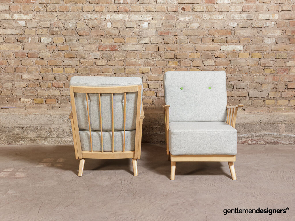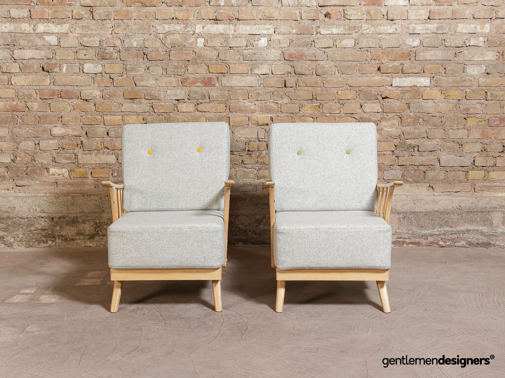 Paire de fauteuils vintage en bois massif restauré avec un tissu gris chinés, circa 1960