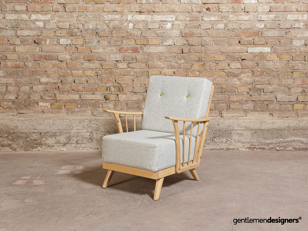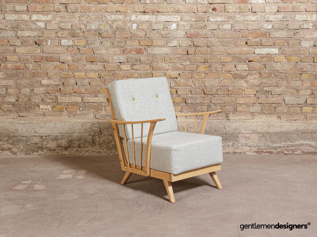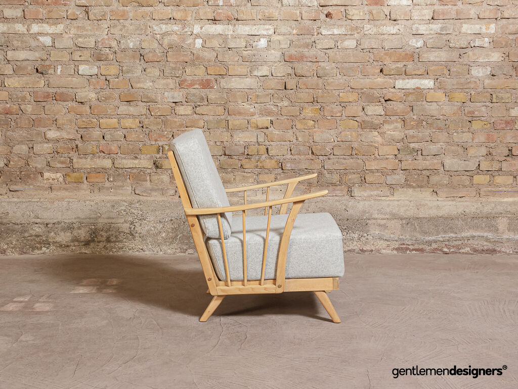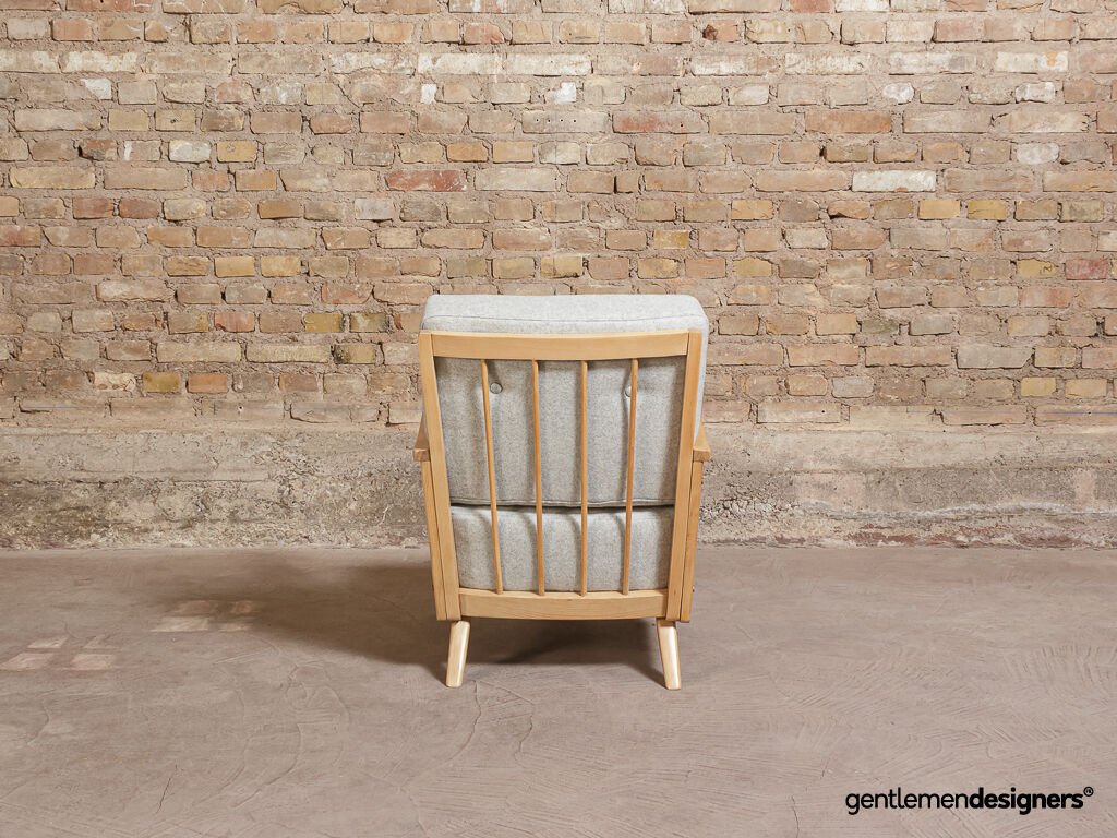 Paire de fauteuils vintage en bois massif restauré avec un tissu gris chinés, circa 1960
