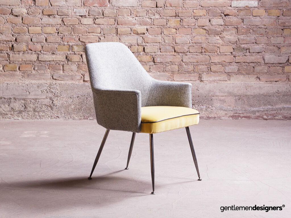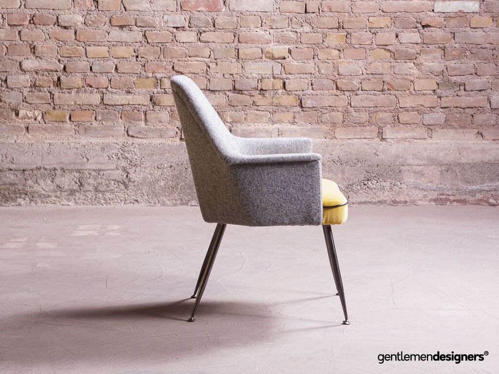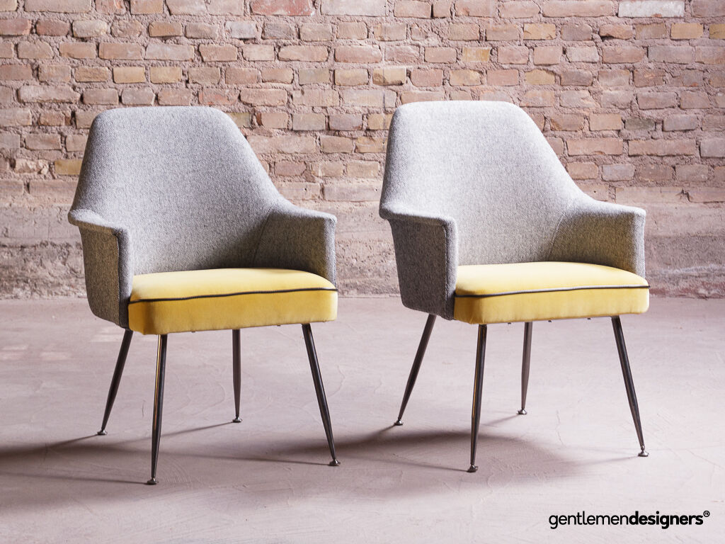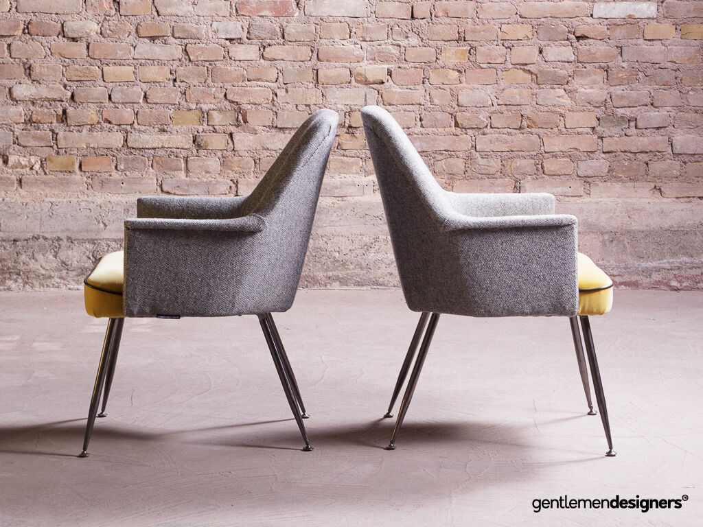 Paire de fauteuils vintage gris, jaune, pieds compas en acier et accoudoirs
