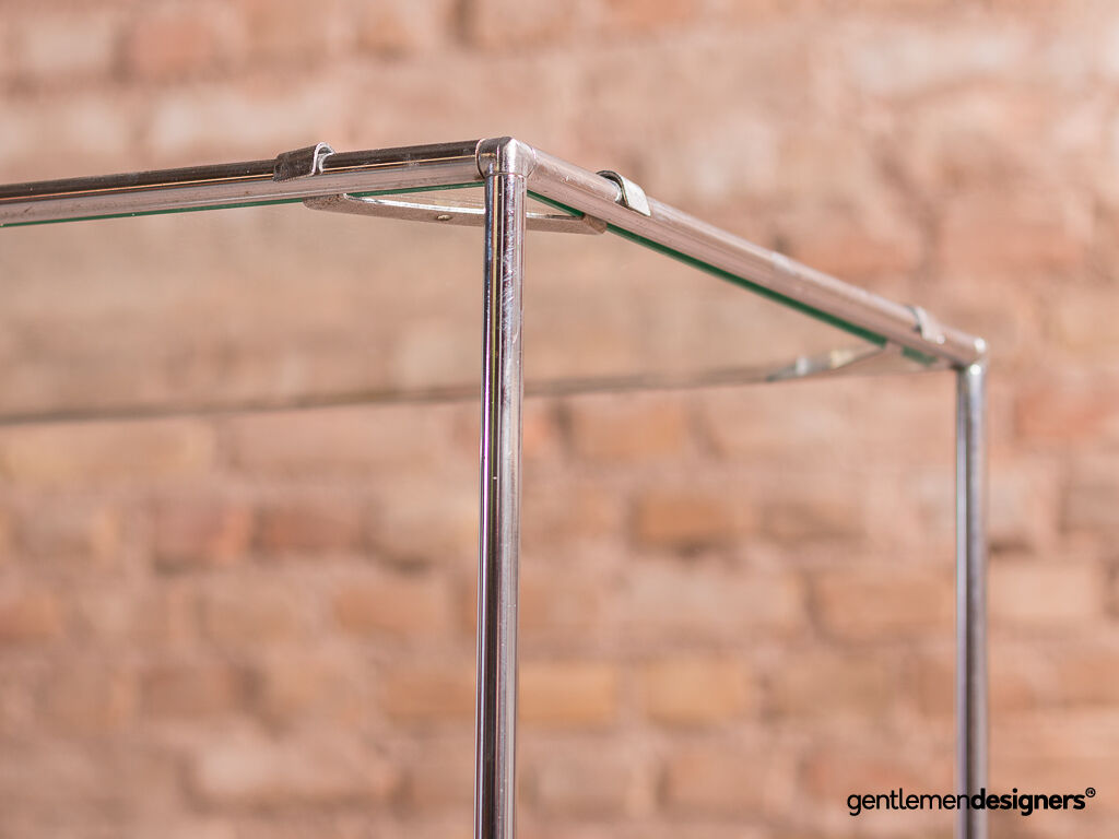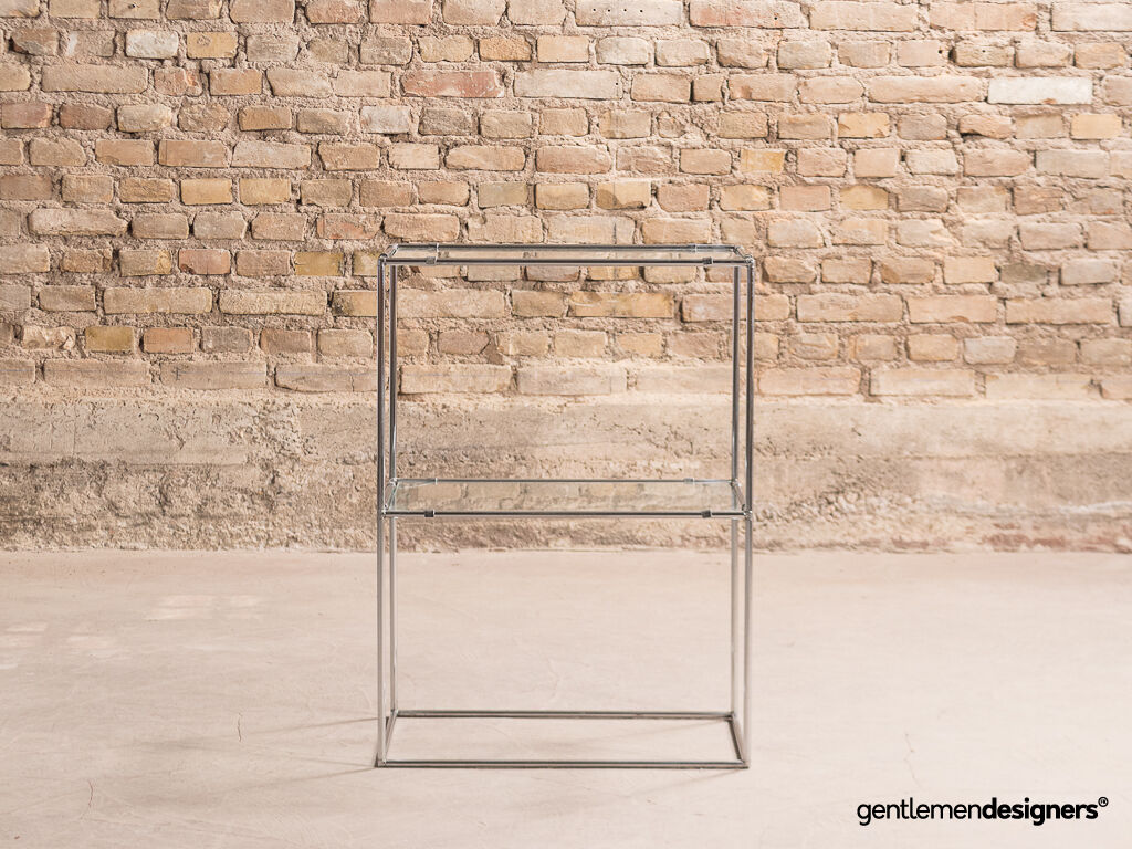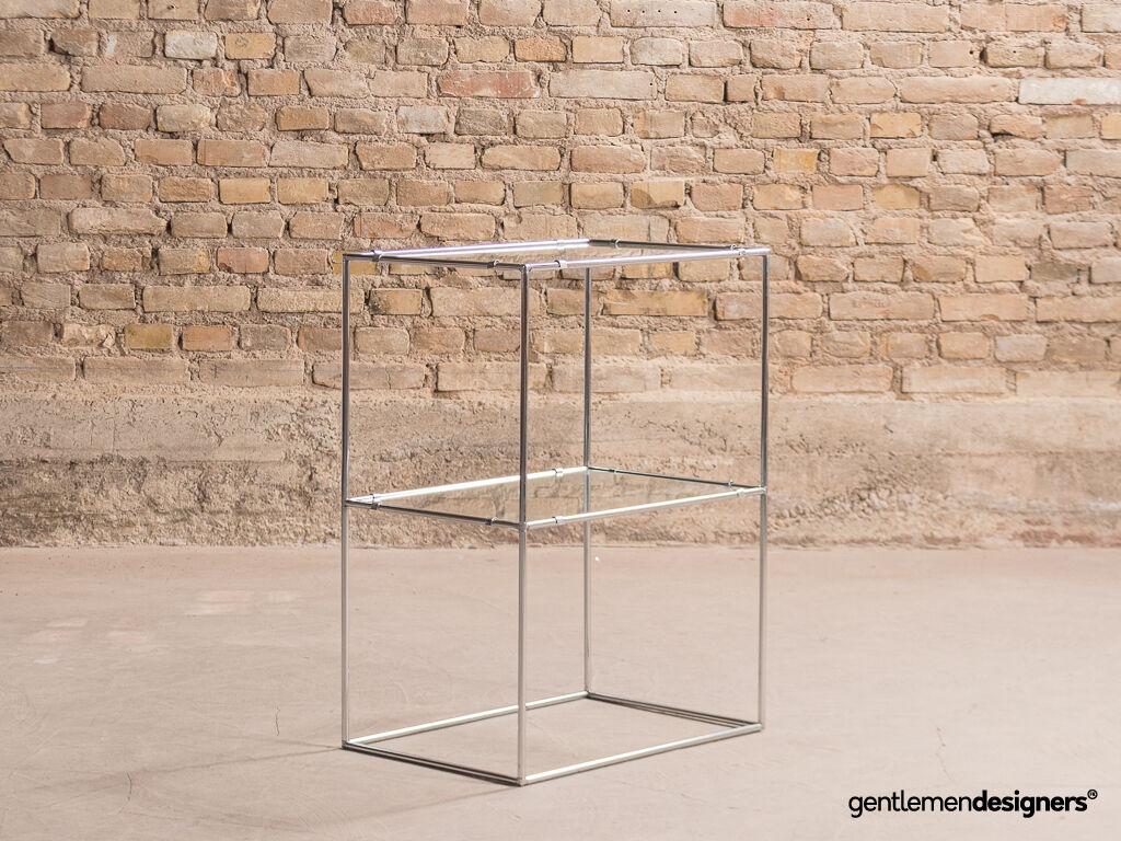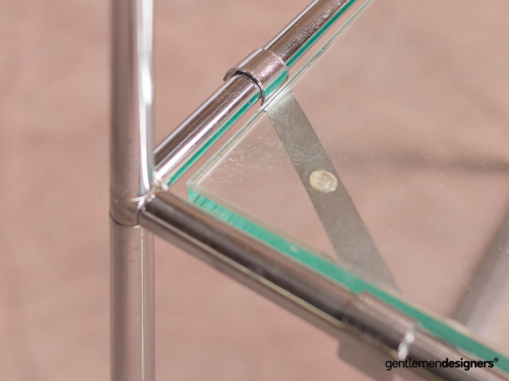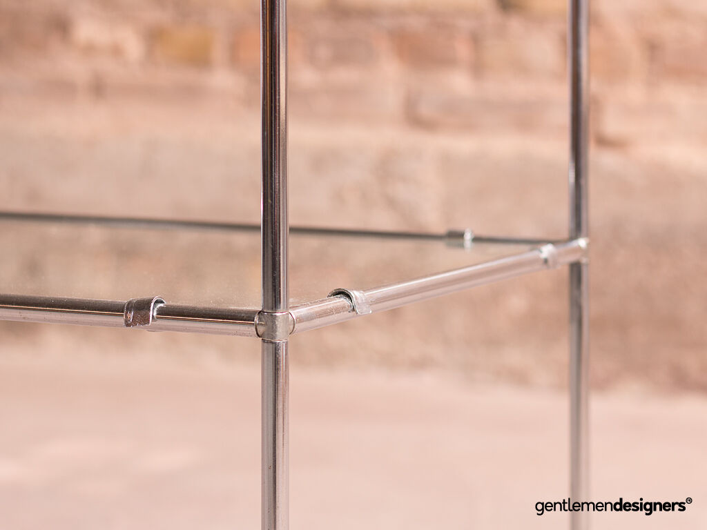 Accueil » Produits » Meubles vintage » Petite étagère composée de deux plaques de verre et d’une structure en acier chromé