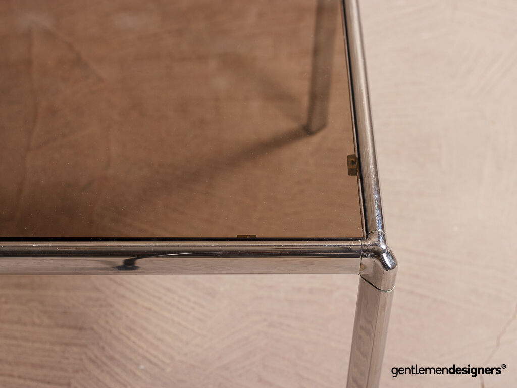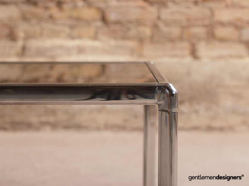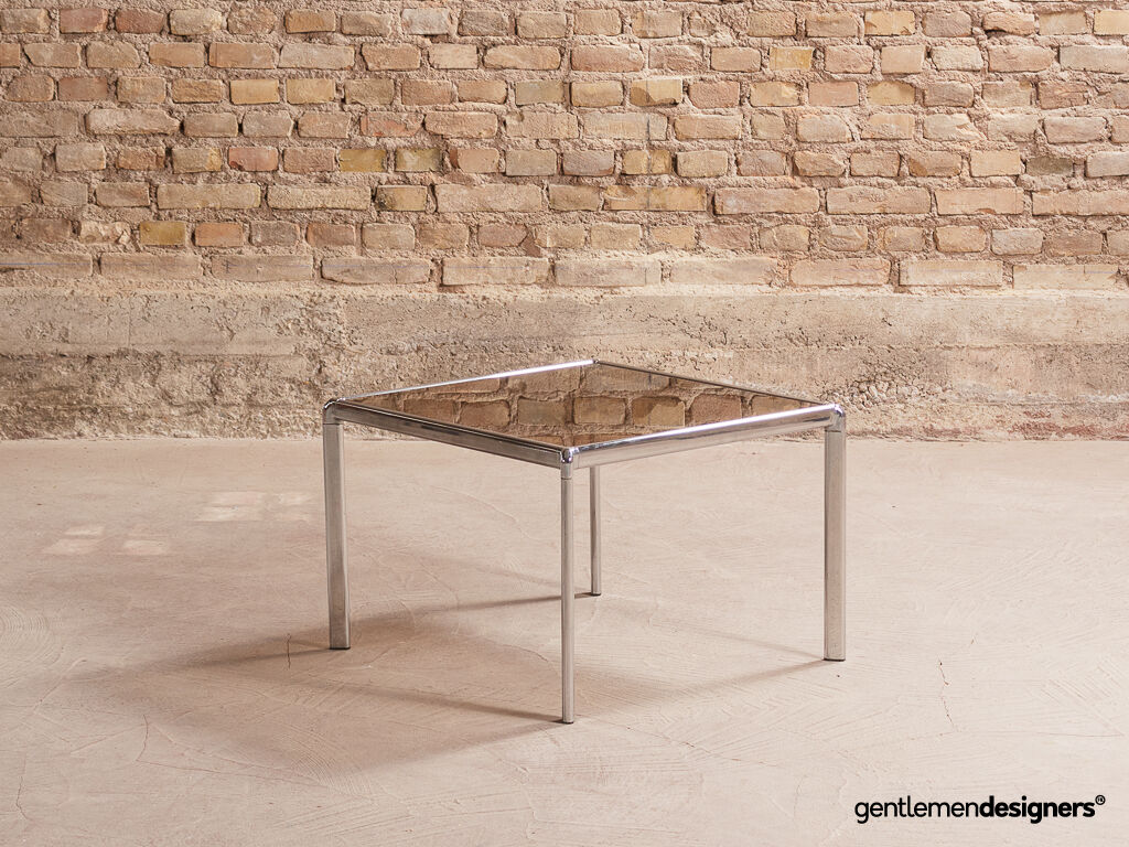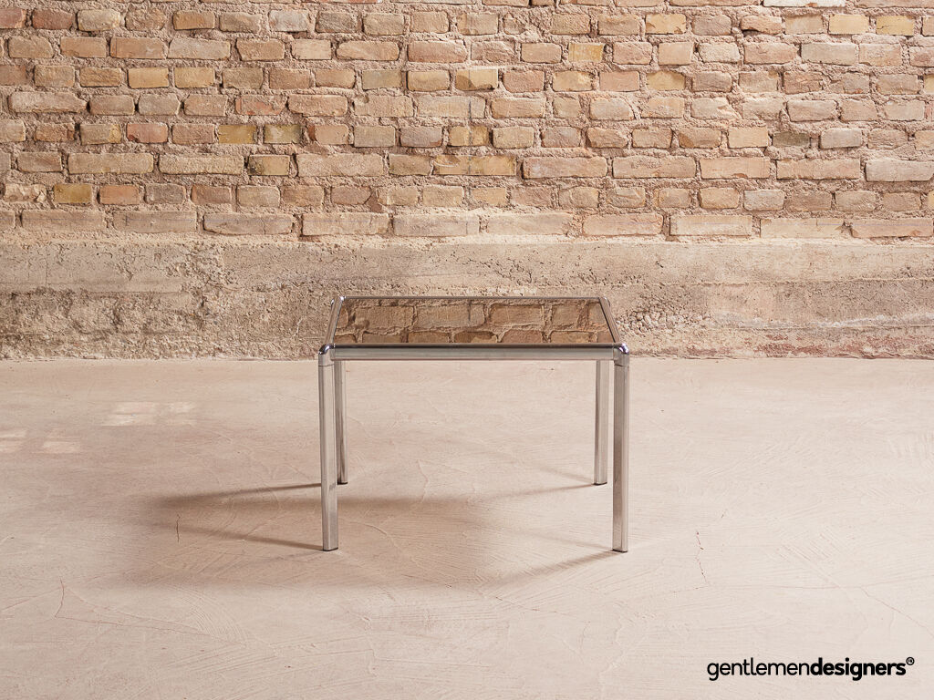 Table basse vintage carrée en verre fumé et piétement chromé, circa 1970