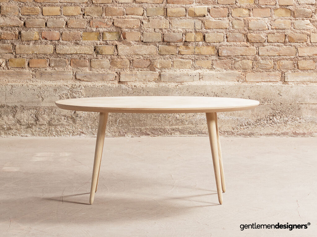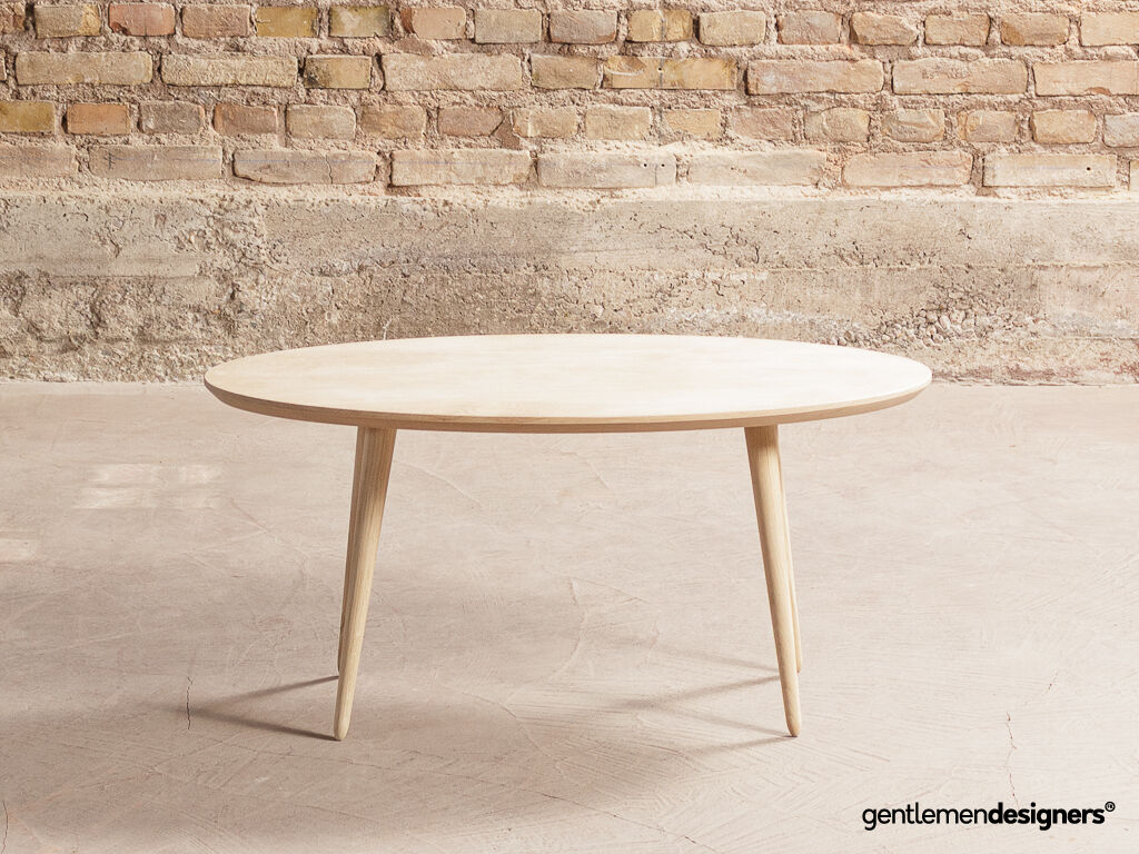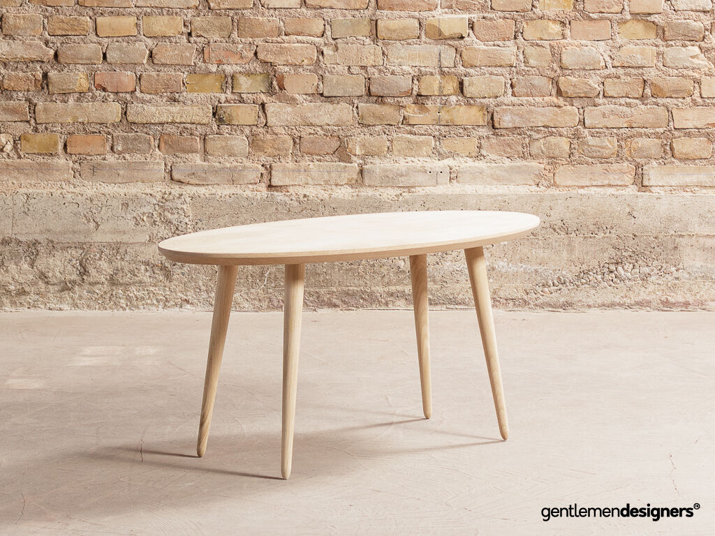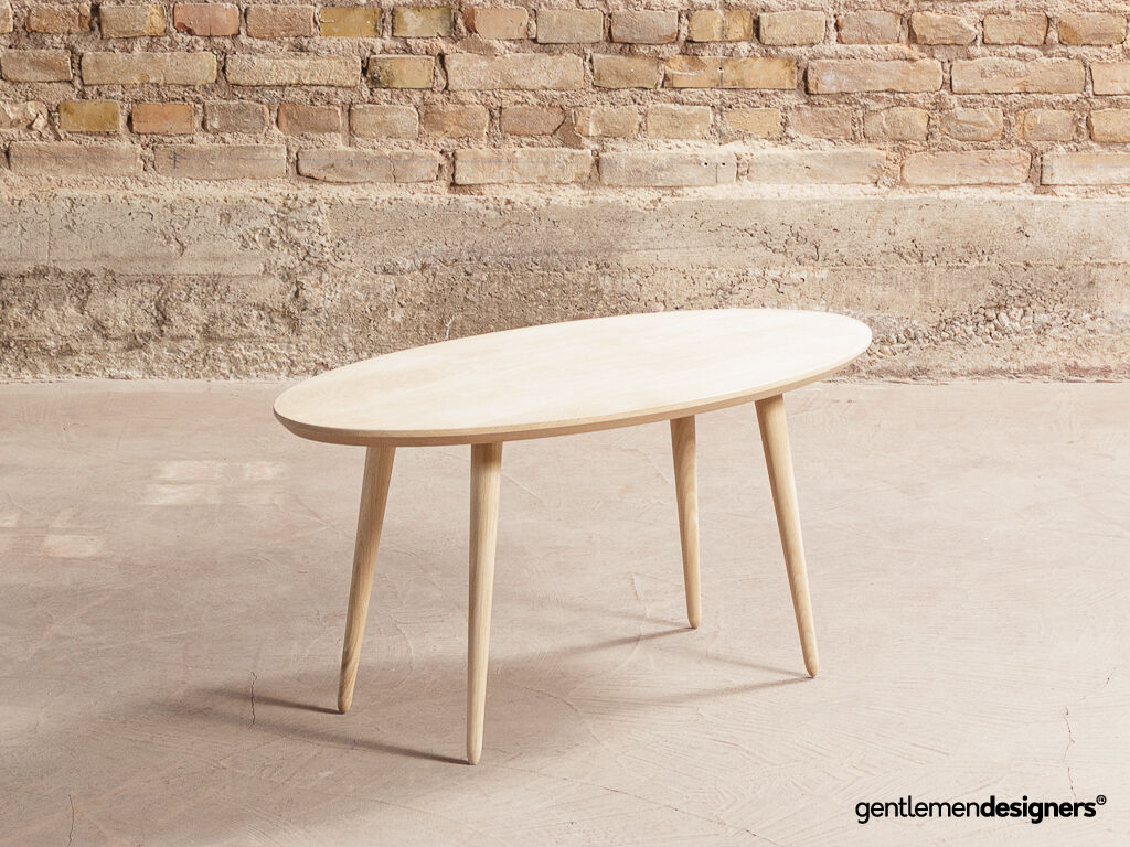 Table basse ovale sur-mesure, plateau et pieds compas en chêne massif local (100x50cm)