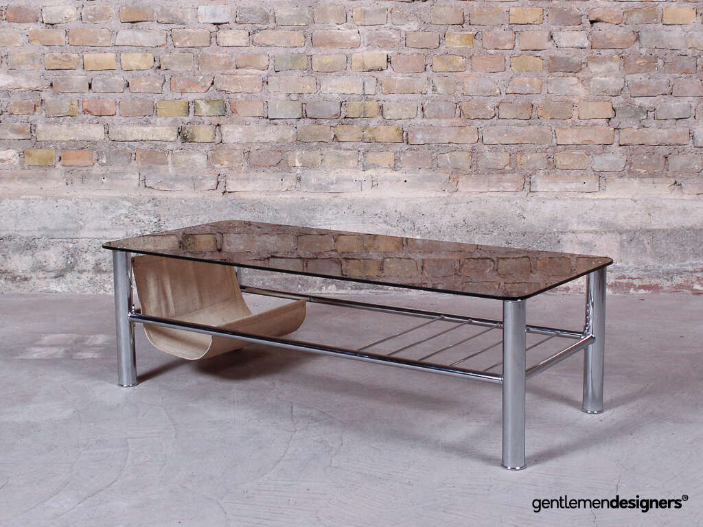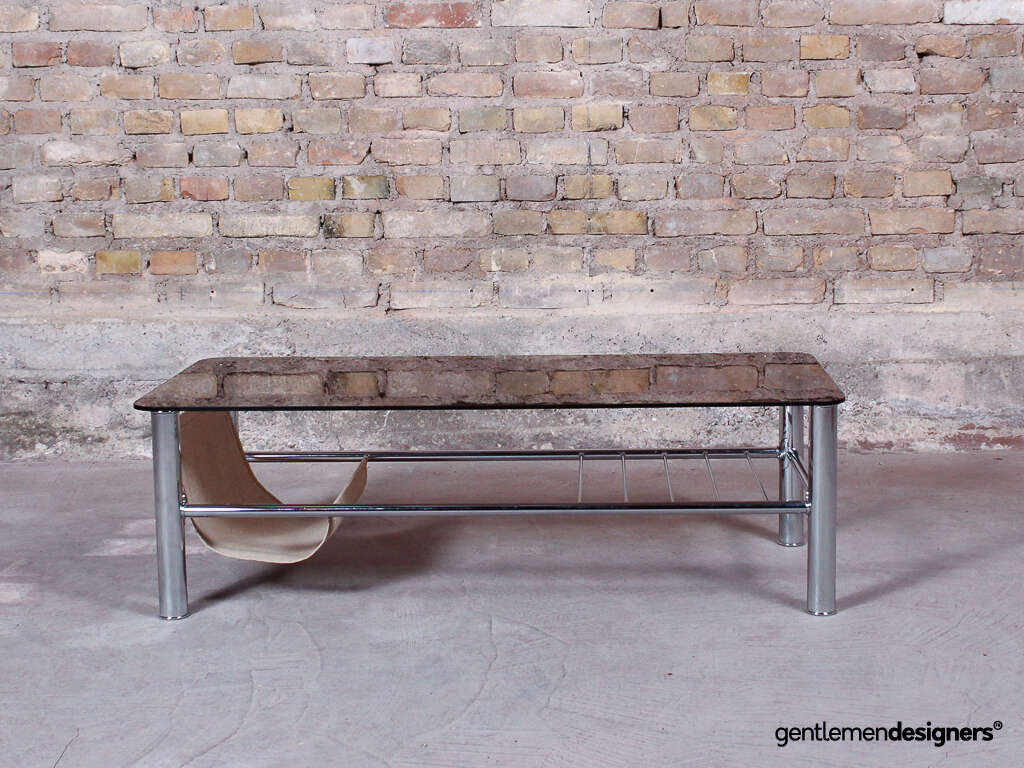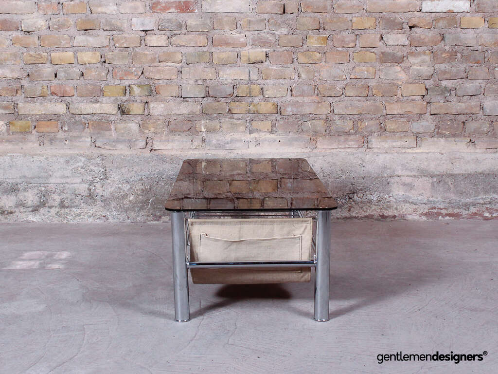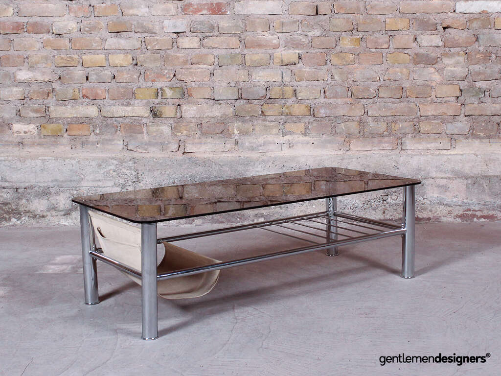 Accueil » Produits » Meubles vintage » Table » Table basse » Table basse rectangle en verre trempé avec porte revues intégré en tissus, circa 1970