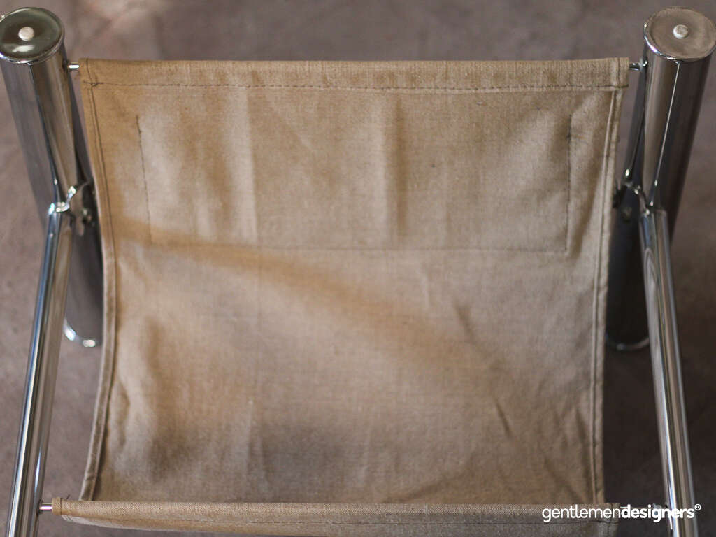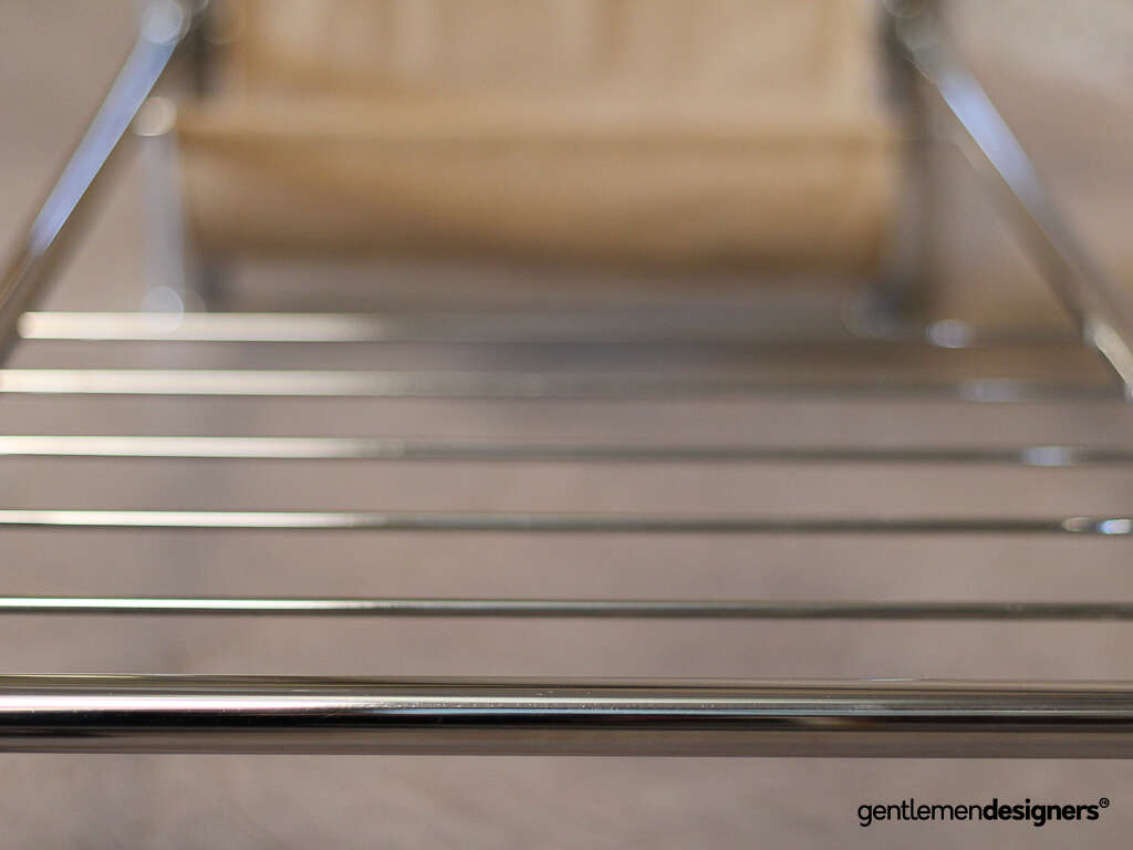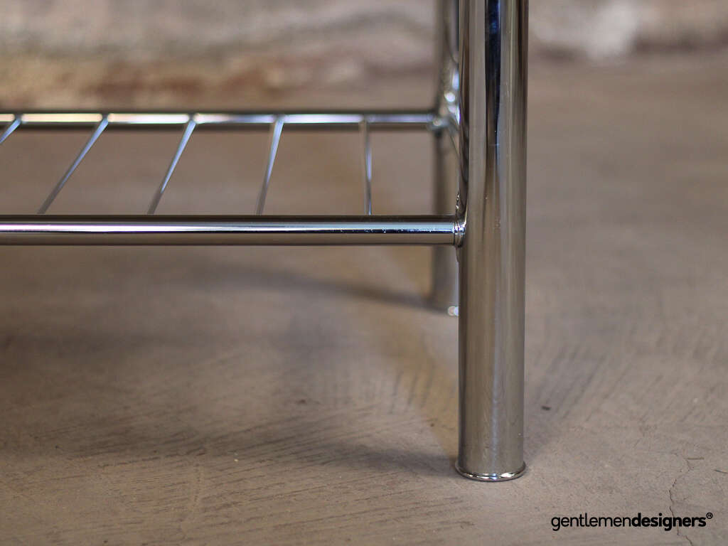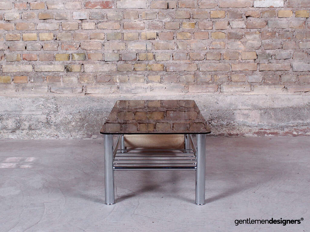 Accueil » Produits » Meubles vintage » Table » Table basse » Table basse rectangle en verre trempé avec porte revues intégré en tissus, circa 1970