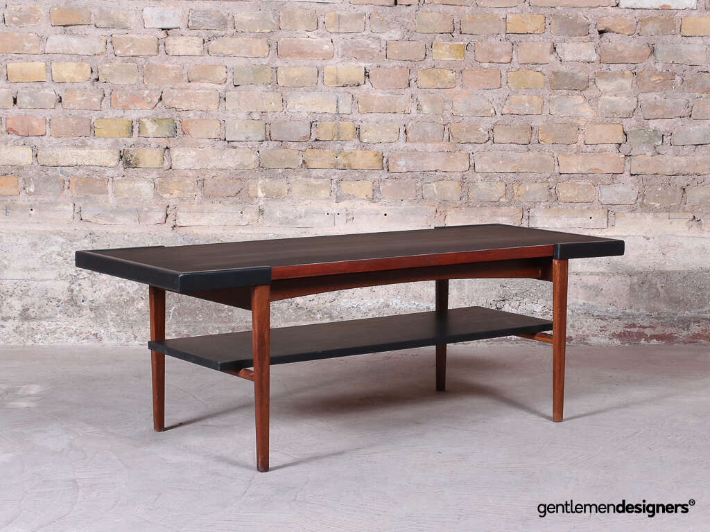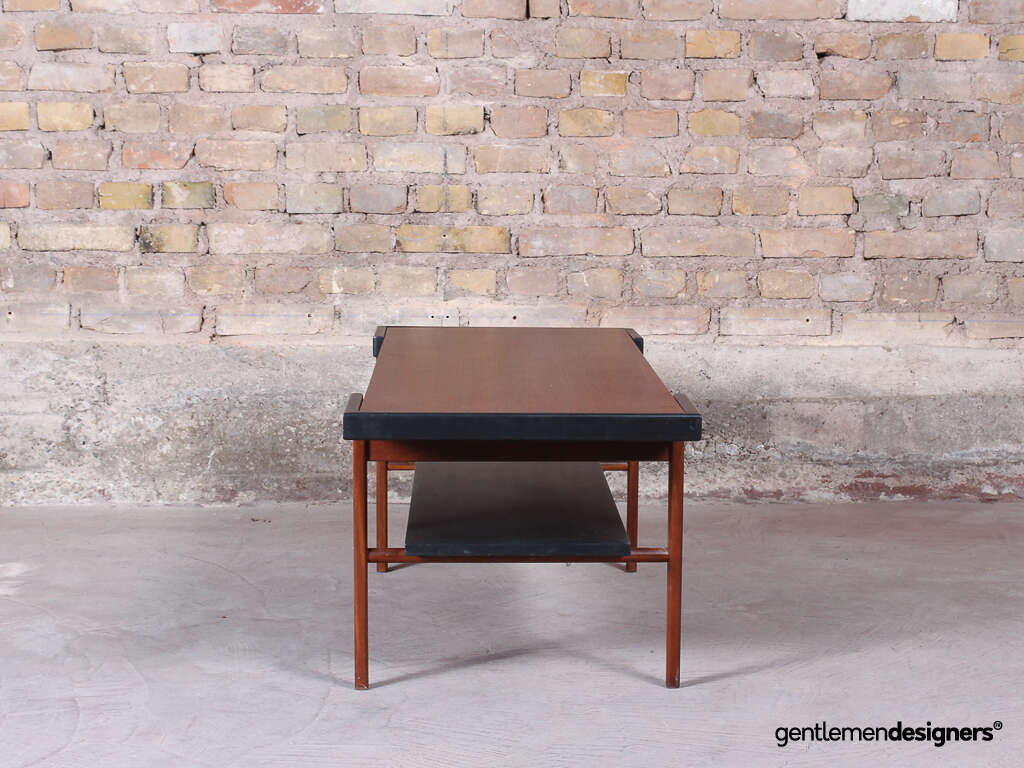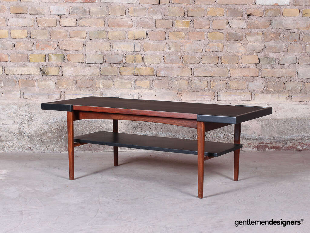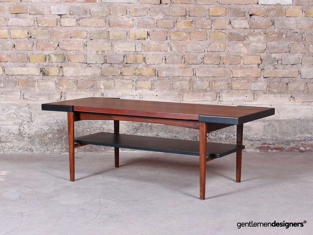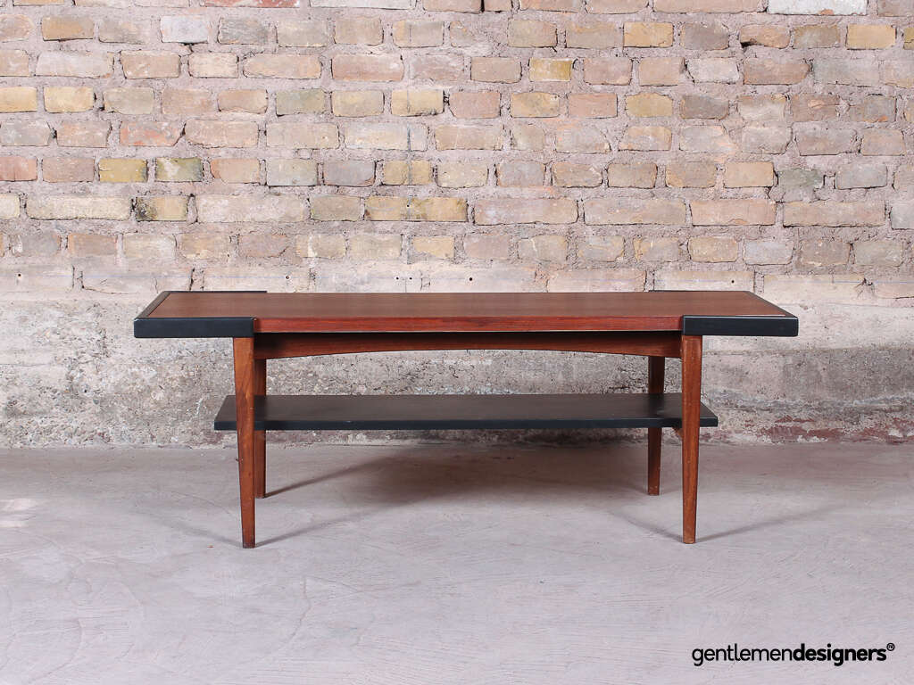 Accueil » Produits » Meubles vintage » Table basse scandinave en teck avec plateau réversible bois ou noir mat