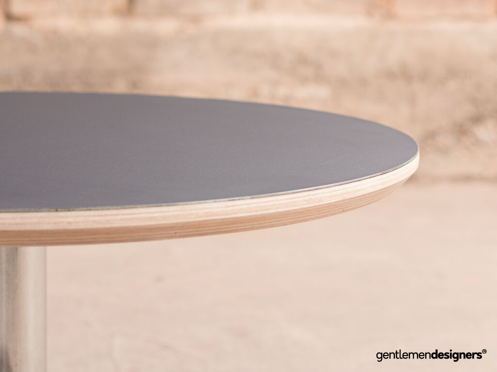 Table basse ronde composée d’un plateau en multiplis plaqué avec un stratifié gris. Le piétement est un élément vintage. Elle trouvera sans nulle doute sa place dans votre salon.