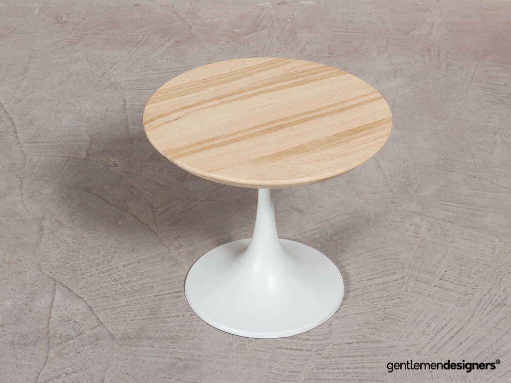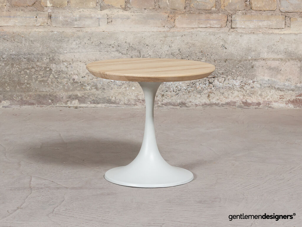 Table basse, table d'appoint, desserte avec pied tulipe et plateau rond en chêne massif