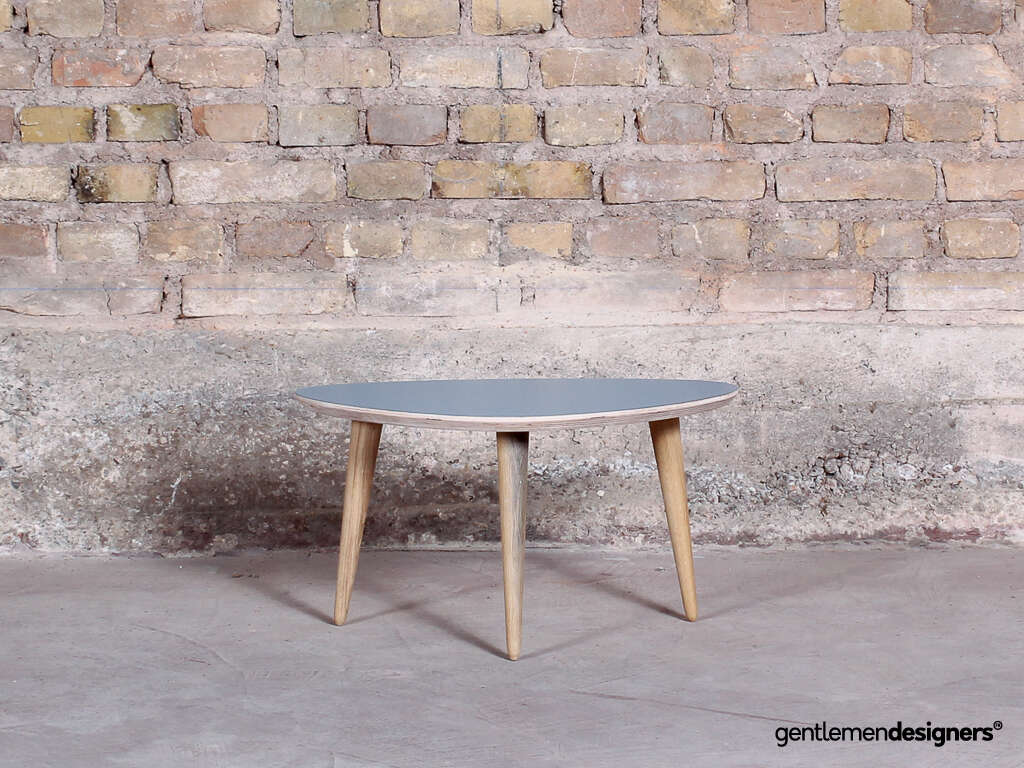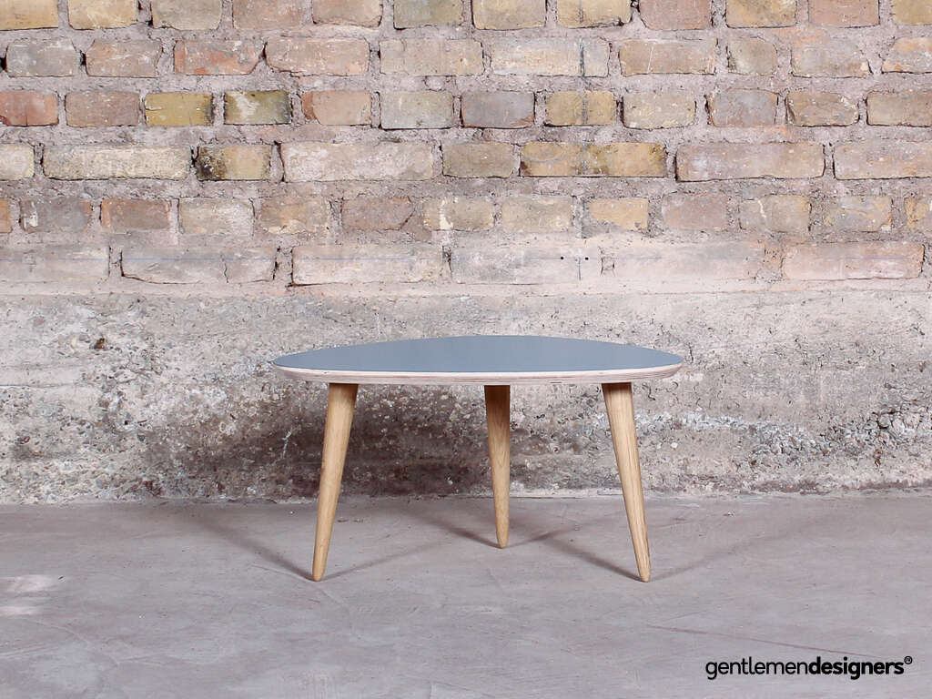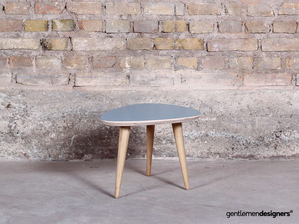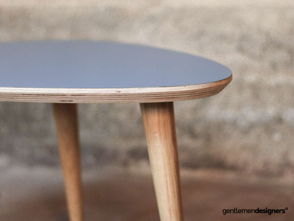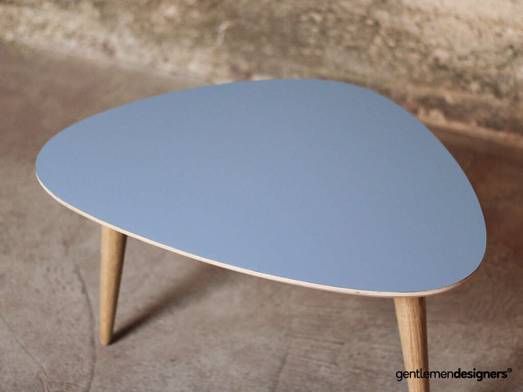 Table basse tripode 60x40cm, plateau bleu, pieds compas chêne massif