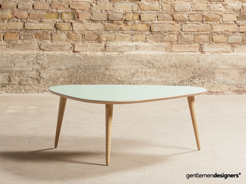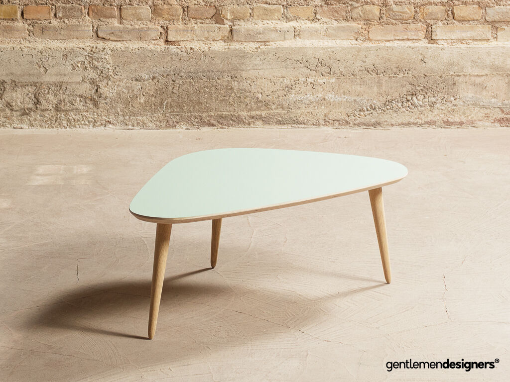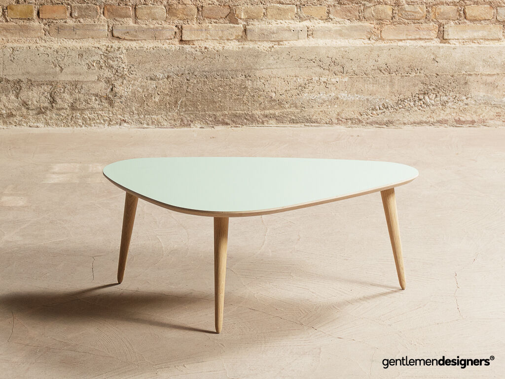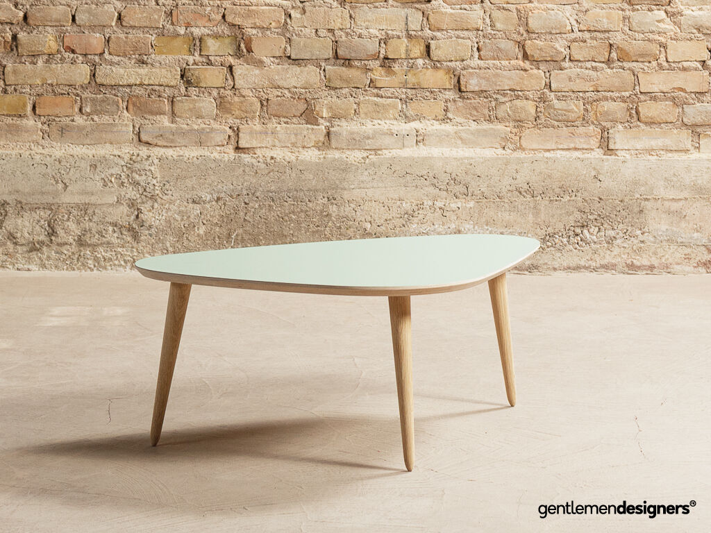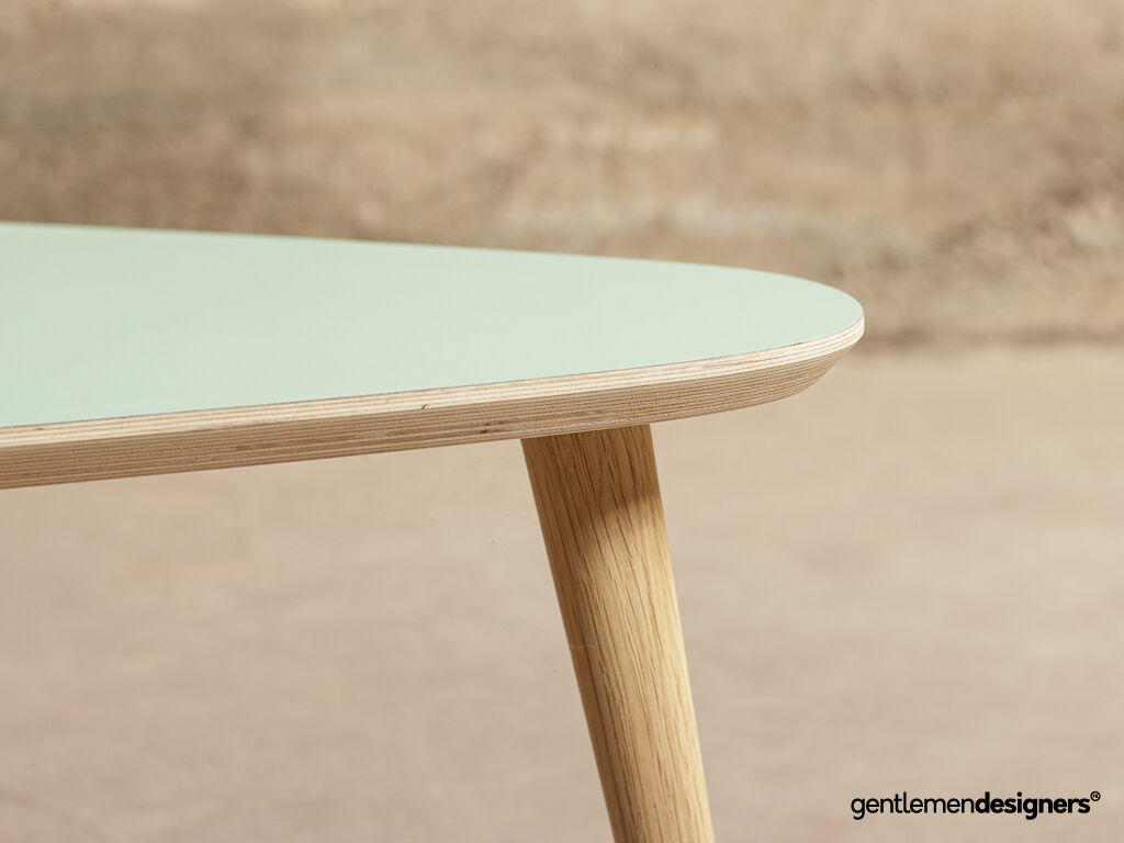 Table basse tripode sur-mesure, plateau stratifié vert de gris et pieds compas en chêne massif (95x65cm)